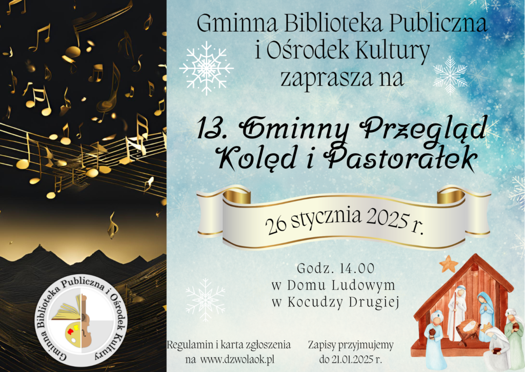 13.Gminny Przegląd Kolęd i Pastorałek już wkrótce! Opublikowano dnia: 17 stycznia 2025 - 14:00 Zapraszamy na Gminny Przegląd Kolęd i Pastorałek do Kocudzy!