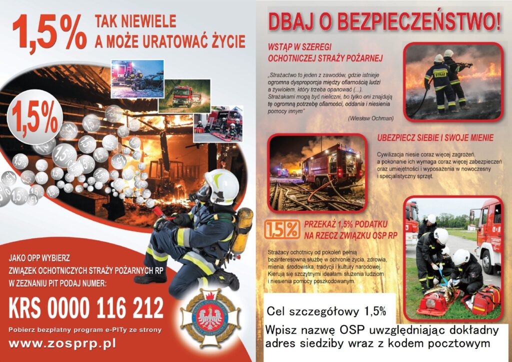 Przekażcie swój 1,5% na jednostkę Ochotniczej Straży Pożarnej na swoim terenie, która dba o bezpieczeństwo i od pokoleń pełni bezinteresowną służbę w ochronie życia, zdrowia i mienia ludzkiego. Podniesie to ich gotowość do działań ratowniczo-gaśniczych, szkoleniowych, wychowawczych, kulturalno-oświatowych, itp. Zachęcajcie rodziny, przyjaciół, znajomych, firmy do przekazania 1,5% podatku na rzecz ochotniczego pożarnictwa. 1,5% to tak niewiele a jednak może uratować komuś życie.
