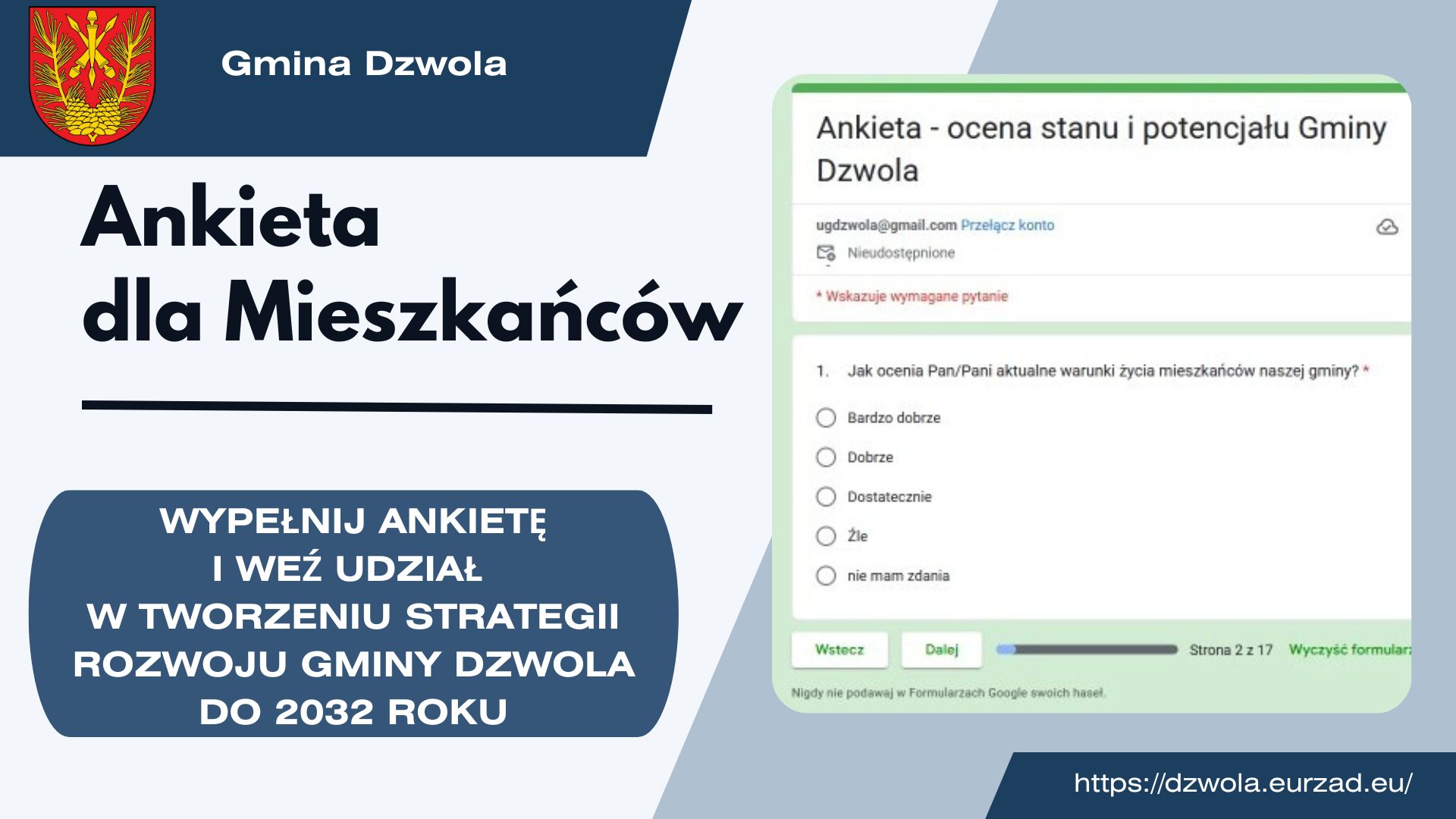 W związku z rozpoczęciem prac nad opracowaniem diagnozy sytuacji społecznej, gospodarczej i przestrzennej dla potrzeb Strategii Rozwoju Gminy Dzwola do 2032 roku, uprzejmie prosimy o wypełnienie przeznaczonej dla Państwa anonimowej ankiety dotyczącej oceny stanu i potencjału Gminy Dzwola. Państwa opinie i wskazania będą stanowić kluczowy element procesu planowania strategicznego w gminie.
