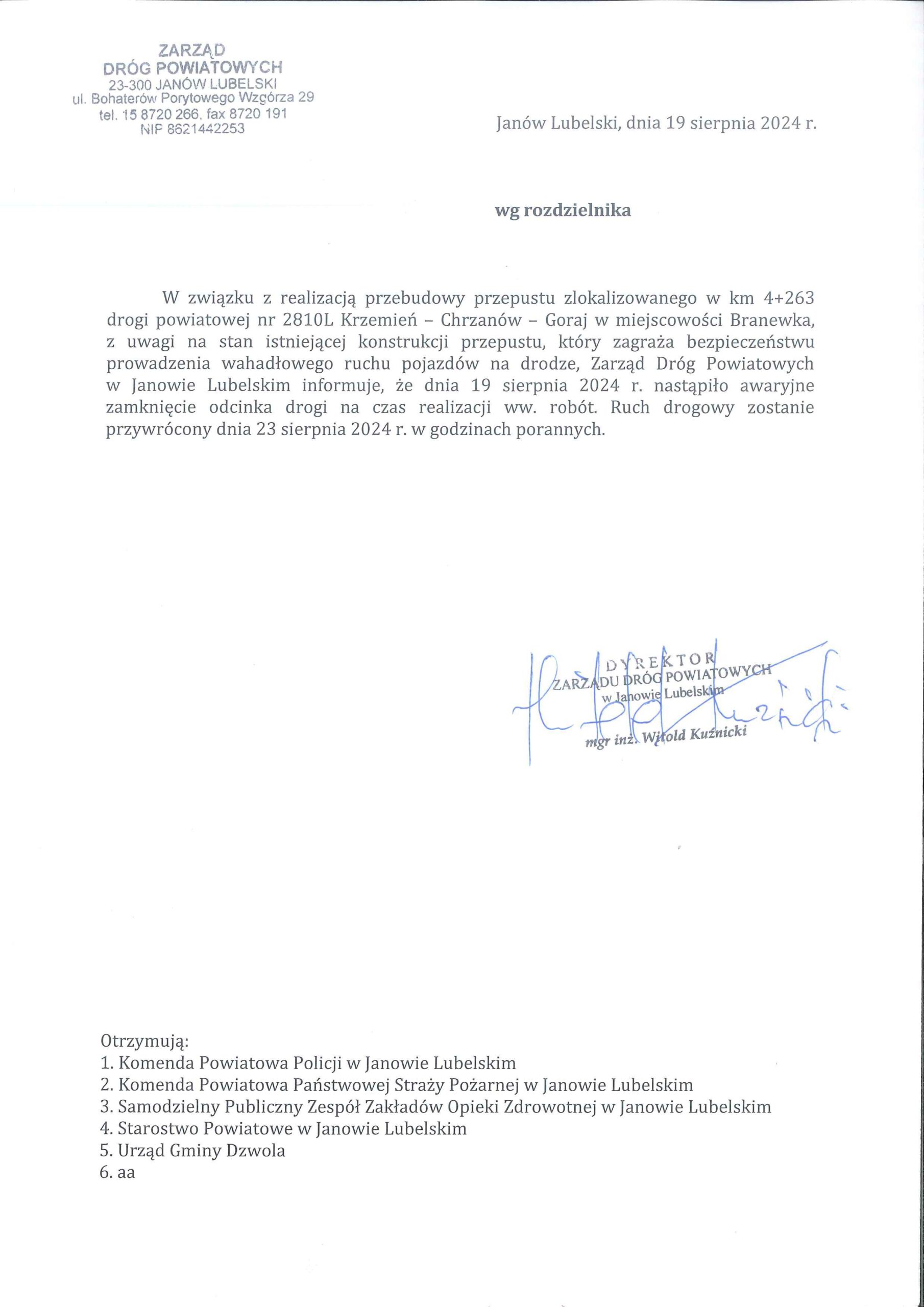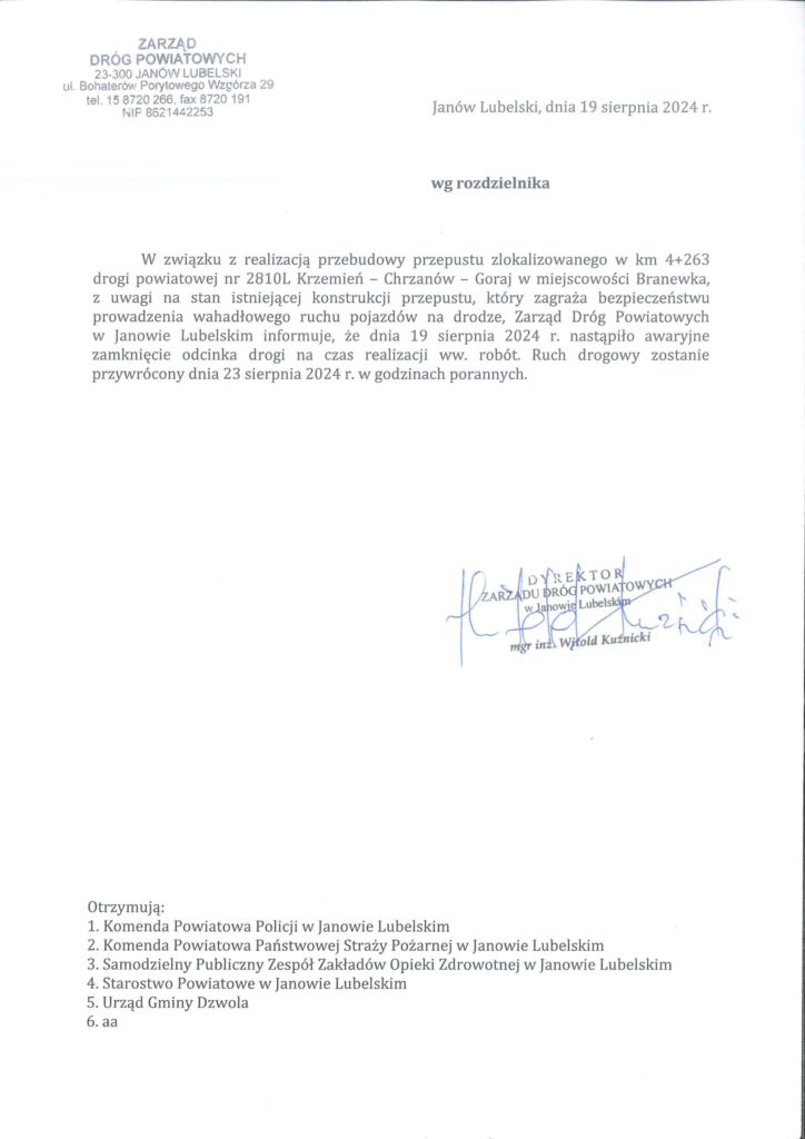 Awaryjne zamknięcie odcinka drogi powiatowej nr 2810L w miejscowości Branewka Opublikowano dnia: 20 sierpnia 2024 - 05:54 Awaryjne zamknięcie odcinka drogi powiatowej nr 2810L do dnia 23 sierpnia 2024 r. w miejscowości Branewka.