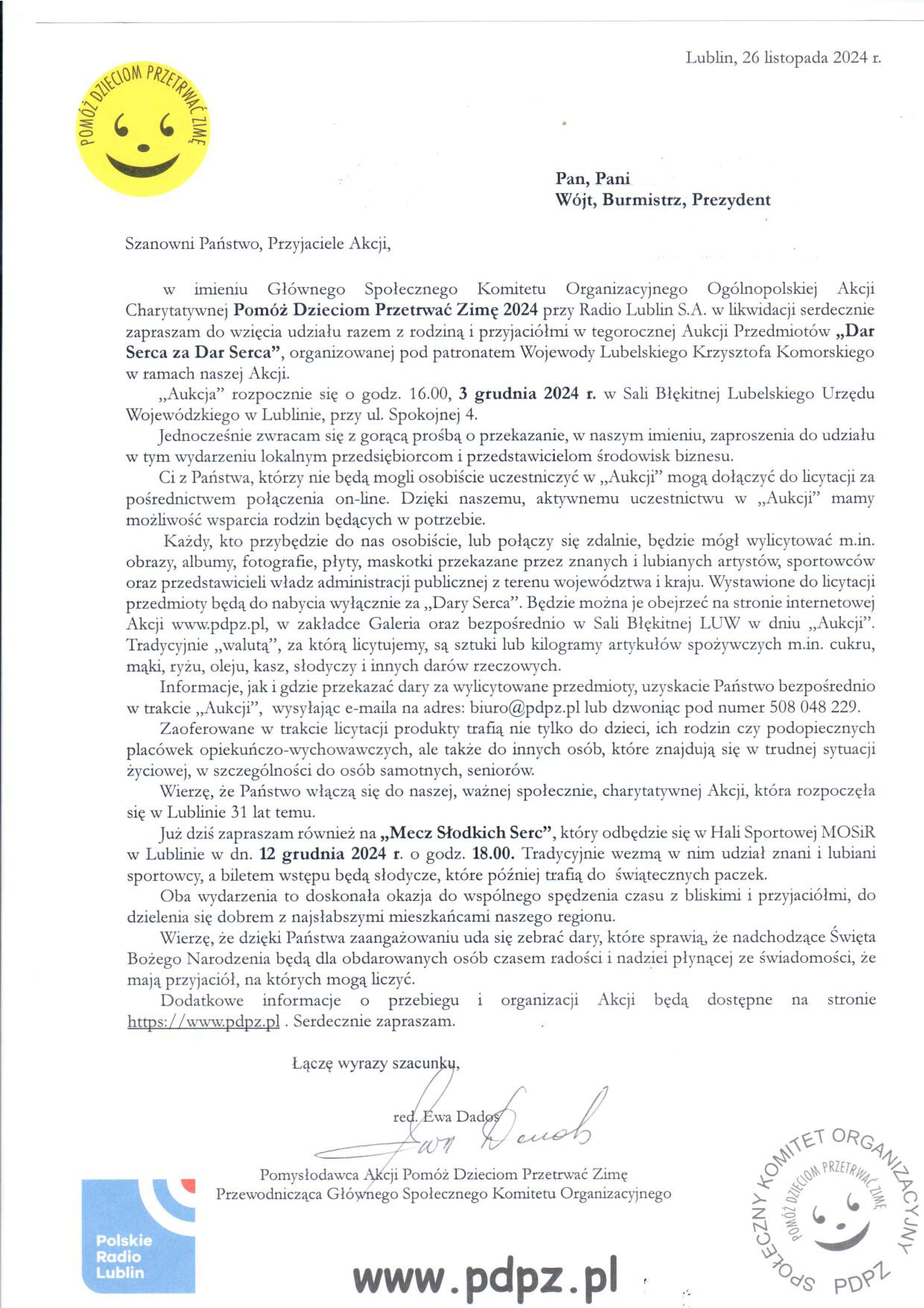 Zachęcamy do udziału w tegorocznej „Charytatywnej Aukcji Przedmiotów_Dar Serca za Dar Serca” organizowanej w ramach Akcji „Pomóż Dzieciom Przetrwać Zimę” pod patronatem honorowym Wojewody Lubelskiego Pana Krzysztofa Komorskiego.  Aukcja rozpocznie się o godz. 16:00, 3 grudnia 2024 roku w Sali Błękitnej Lubelskiego Urzędu Wojewódzkiego w Lublinie., przy ul. Spokojnej 4.