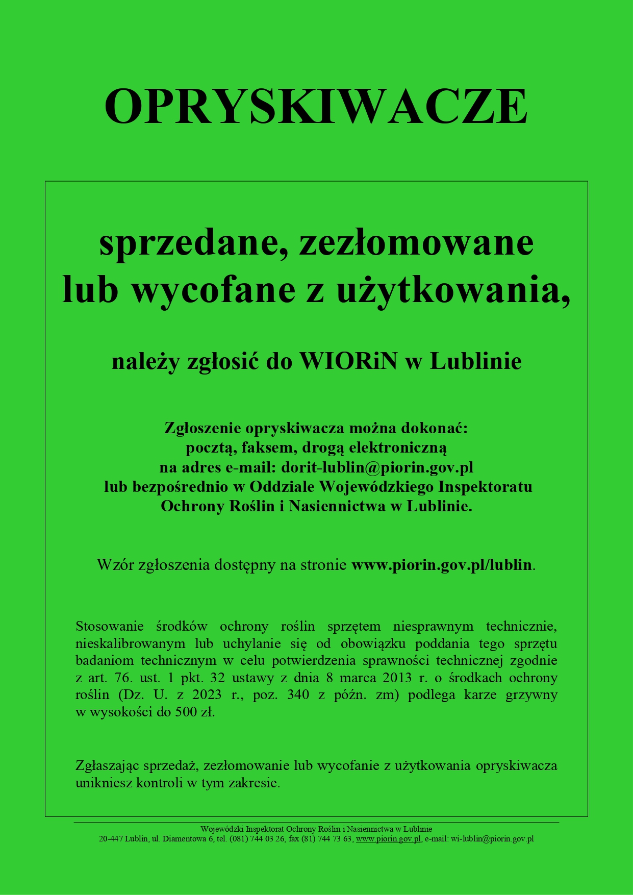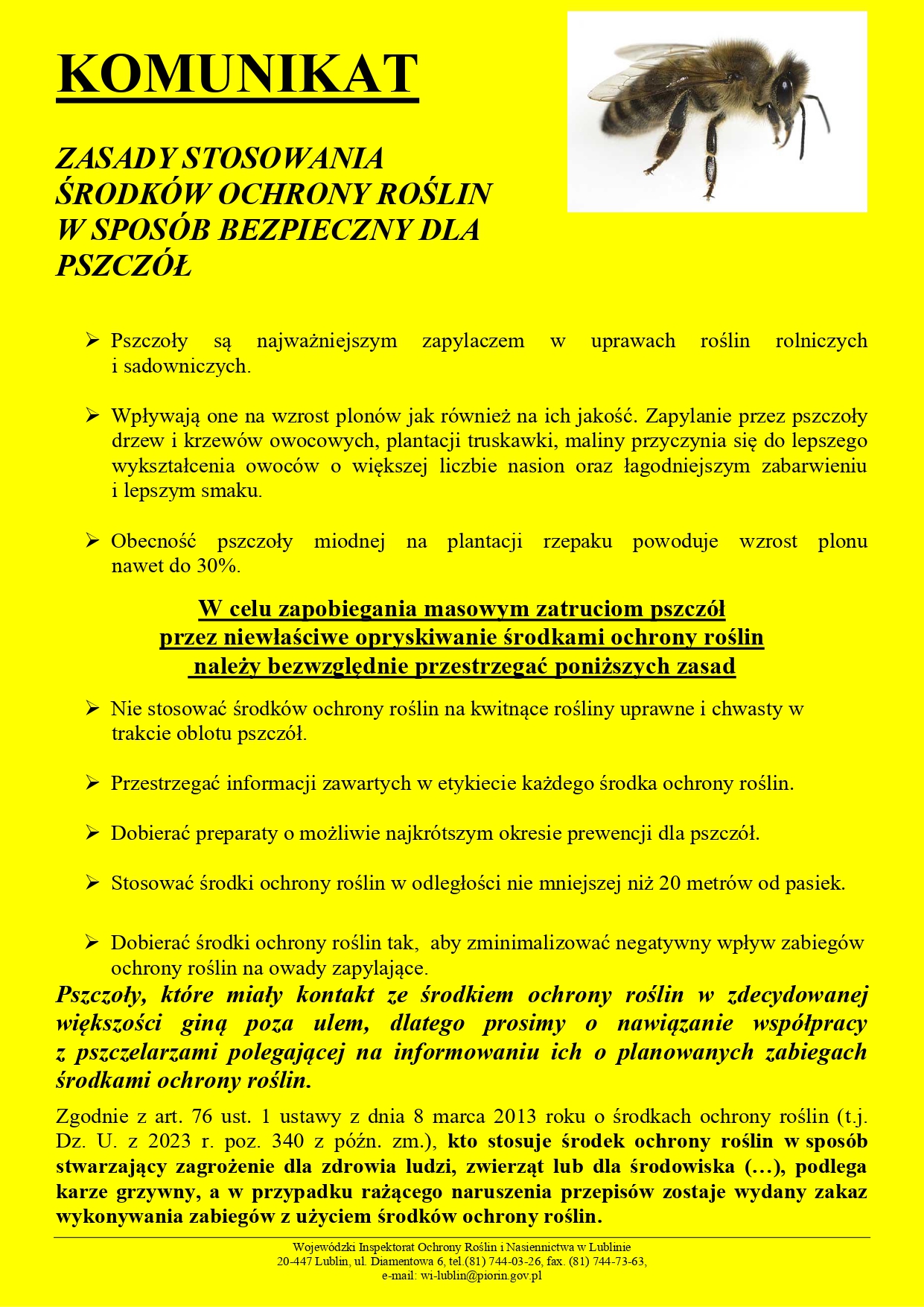 Pozostałe z załączonych komunikatów dotyczą zachowania zasad bezpieczeństwa podczas stosowania środków ochrony roślin. W praktyce rolniczej i ogrodniczej wiosna to czas intensywnych prac, w tym przeprowadzania przez mieszkańców miast i wsi wielu zabiegów związanych z ochroną roślin. Ich przestrzeganie jest szczególnie ważne w okresie kwitnienia roślin uprawnych i dzikorosnących oraz związanego z tym procesu zapylania przez pszczoły i inne owady. Należy nadmienić, że stosowanie środków ochrony roślin z zachowaniem zasad bezpieczeństwa nie stwarza zagrożenia dla zdrowia ludzi, zwierząt i środowiska. Wymagają one jednak wiedzy, doświadczenia i ostrożności ze strony osób wykonujących te zabiegi. Wyrażam nadzieję, że przestrzeganie zasad zawartych w załączonych komunikatach pozwoli rolnikom cieszyć się obfitymi plonami, zaś mieszkańcom regionu umożliwi korzystanie ze zdrowej żywności pozbawionej pozostałości środków ochrony roślin.