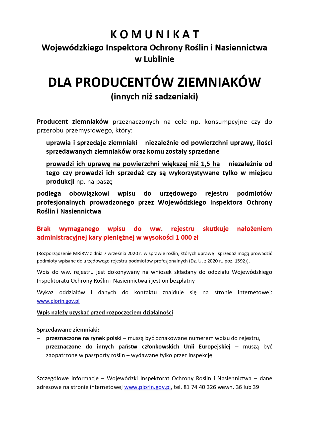 W świetle obowiązującego Rozporządzenia MRiRW z dnia 7 września 2020 r. (Dz.U. z 2020 r., poz. 1592) – § 1.1. „Bulwy roślin gatunku Solanum tuberosum L. inne niż sadzeniaki ziemniaka mogą być uprawiane, magazynowane, pakowane, sortowane, wprowadzane na terytorium Rzeczypospolitej Polskiej lub przemieszczane na tym terytorium, w tym z przeznaczeniem do innych państw członkowskich Unii Europejskiej lub państw trzecich, przez podmioty wpisane do urzędowego rejestru podmiotów profesjonalnych”. Wobec powyższego każdy rolnik, który uprawia i sprzedaje ziemniaki, niezależnie od powierzchni uprawy, ilości sprzedawanych ziemniaków oraz komu zostały sprzedane i / lub który prowadzi ich uprawę na powierzchni większej niż 1,5 ha – niezależnie od tego czy prowadzi ich sprzedaż czy są wykorzystywane tylko w miejscu produkcji, np. na paszę, podlega obowiązkowi wpisu do ww. urzędowego rejestru. Na podstawie prowadzonych kontroli u takich rolników stwierdzamy, że wielu rolników nadal nie przestrzega przepisów prawa w przedmiotowym zakresie. Na podstawie prowadzonych kontroli u takich rolników stwierdzamy, że wielu rolników nadal nie przestrzega przepisów prawa w przedmiotowym zakresie. Brak wpisu do przedmiotowego rejestru skutkuje nałożeniem administracyjnej kary pieniężnej w wysokości 1 000 zł i dla uniknięcia prowadzenia postepowań o nakładanie kar rolnikom proszę o rozpropagowanie załączonego komunikatu.