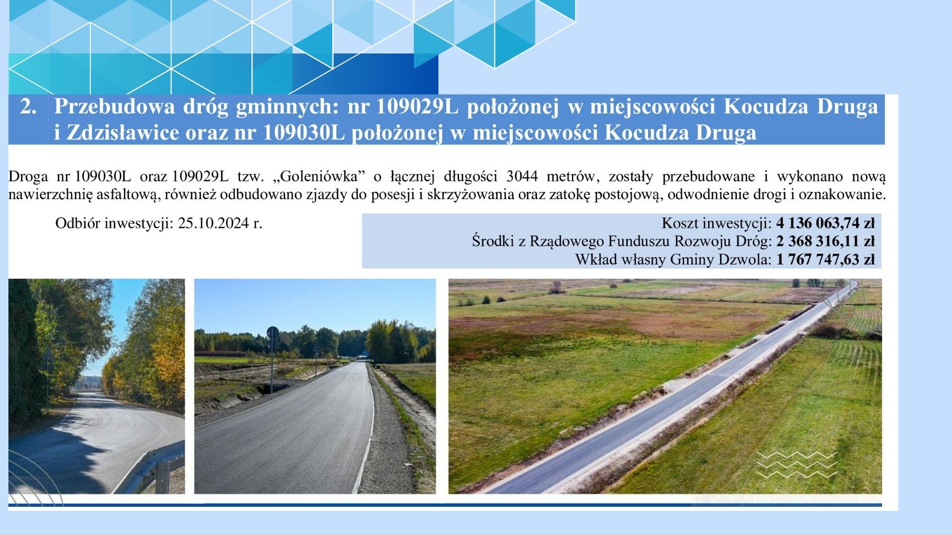 Rok 2024 to zdecydowanie udany rok pod względem inwestycji drogowych. Zakres robót na drogach w gminie był bardzo szeroki. W minionym czasie zostało oddanych do użytku szereg odnowionych dróg, służących wszystkim uczestnikom ruchu drogowego. W 2024 roku na terenie Gminy Dzwola wykonano zadania w infrastrukturze drogowej gminnej i powiatowej o łącznej wartości prawie 14 mln zł, zmodernizowano łącznie ponad 7,5 km dróg.