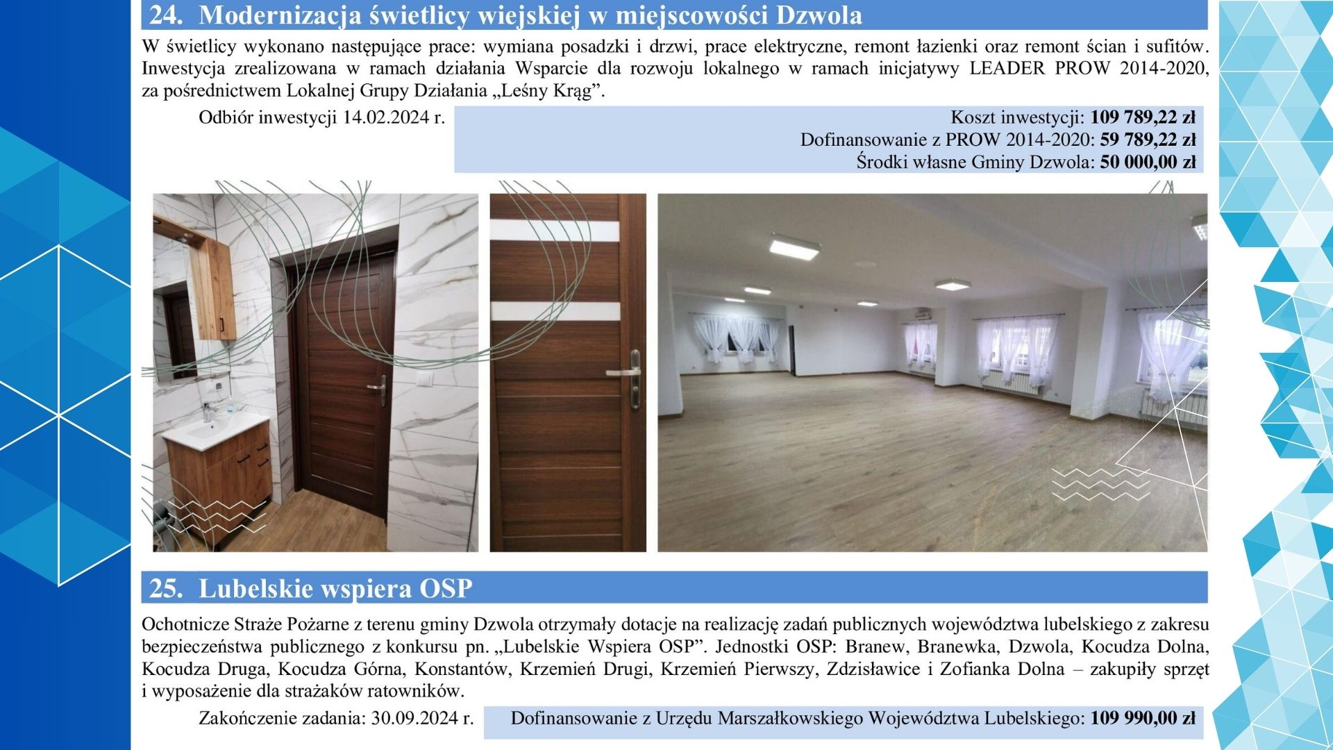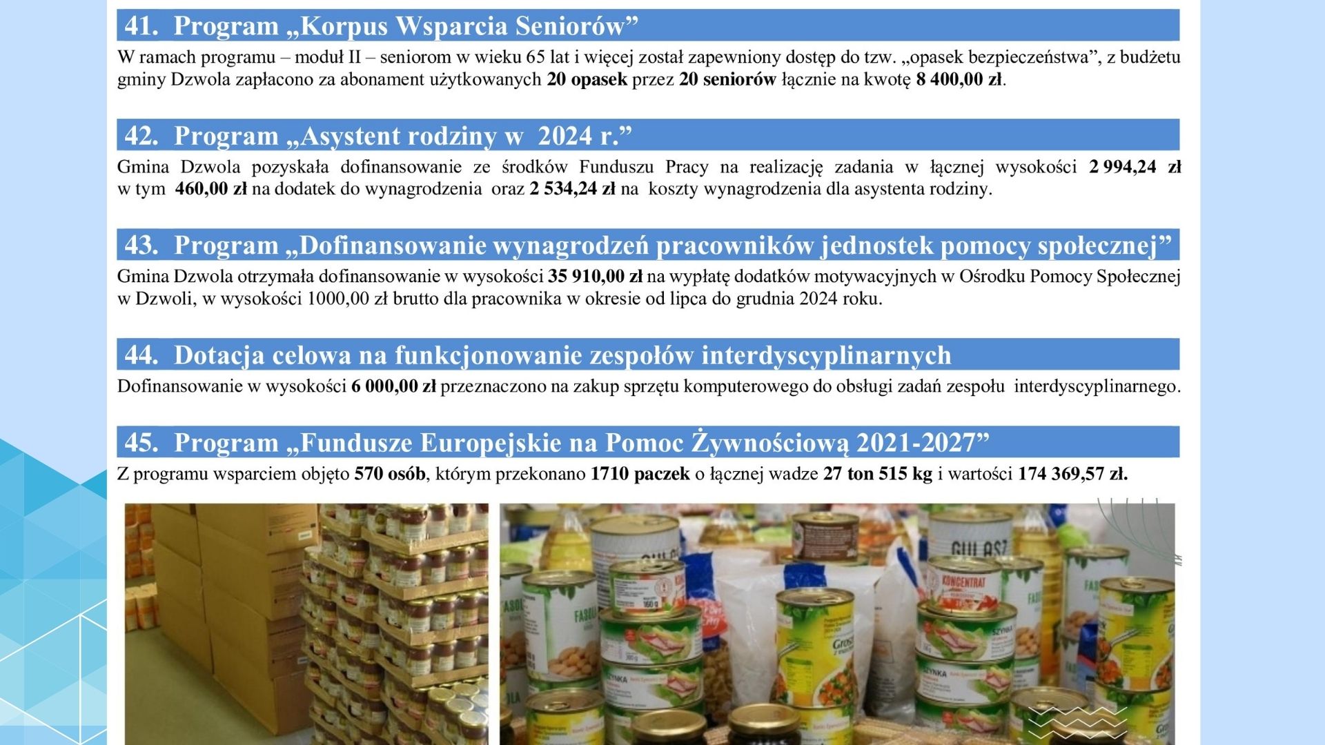 Zbliża się koniec roku 2024, zatem to dobry moment na podsumowanie i przypomnienie. Dzięki zaangażowaniu wielu osób w roku 2024 wykonaliśmy szereg dużych i małych inwestycji na terenie całej gminy Dzwola. Staraliśmy się, by realizowane działania pozytywnie zmieniały otoczenie, tworzyły nowe możliwości, lepsze warunki do życia i zamieszkania, bo dobro mieszkańców naszej gminy jest dla nas bardzo ważne.