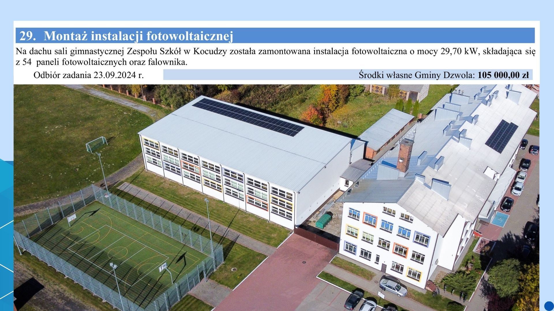 W placówkach oświatowych na terenie gminy Dzwola zrealizowano również ważne inwestycje m.in.: termomodernizacja budynku Zespołu Szkół w Krzemieniu – wartość inwestycji wyniosła 4,15 mln zł. Inwestycje w oświatę mają na celu poprawienie warunków i poziomu nauczania, co stanowi dla naszej gminy jedno z ważniejszych zadań.