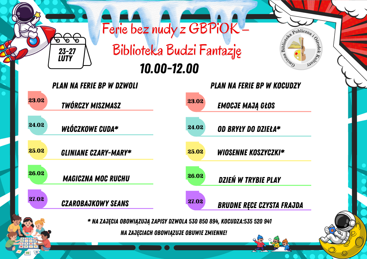 Ferie bez nudy z GBPiOK Opublikowano dnia: 13 lutego 2026 - 18:20 Zapraszamy dzieci i młodzież szkolną na Ferie bez nudy z GBPiOK pod hasłem Biblioteka Budzi Fantazję!Zajęcia odbywać się będą w drugim tygodniu ferii od poniedziałku do piątku w godzinach 10.00 – 12.00.