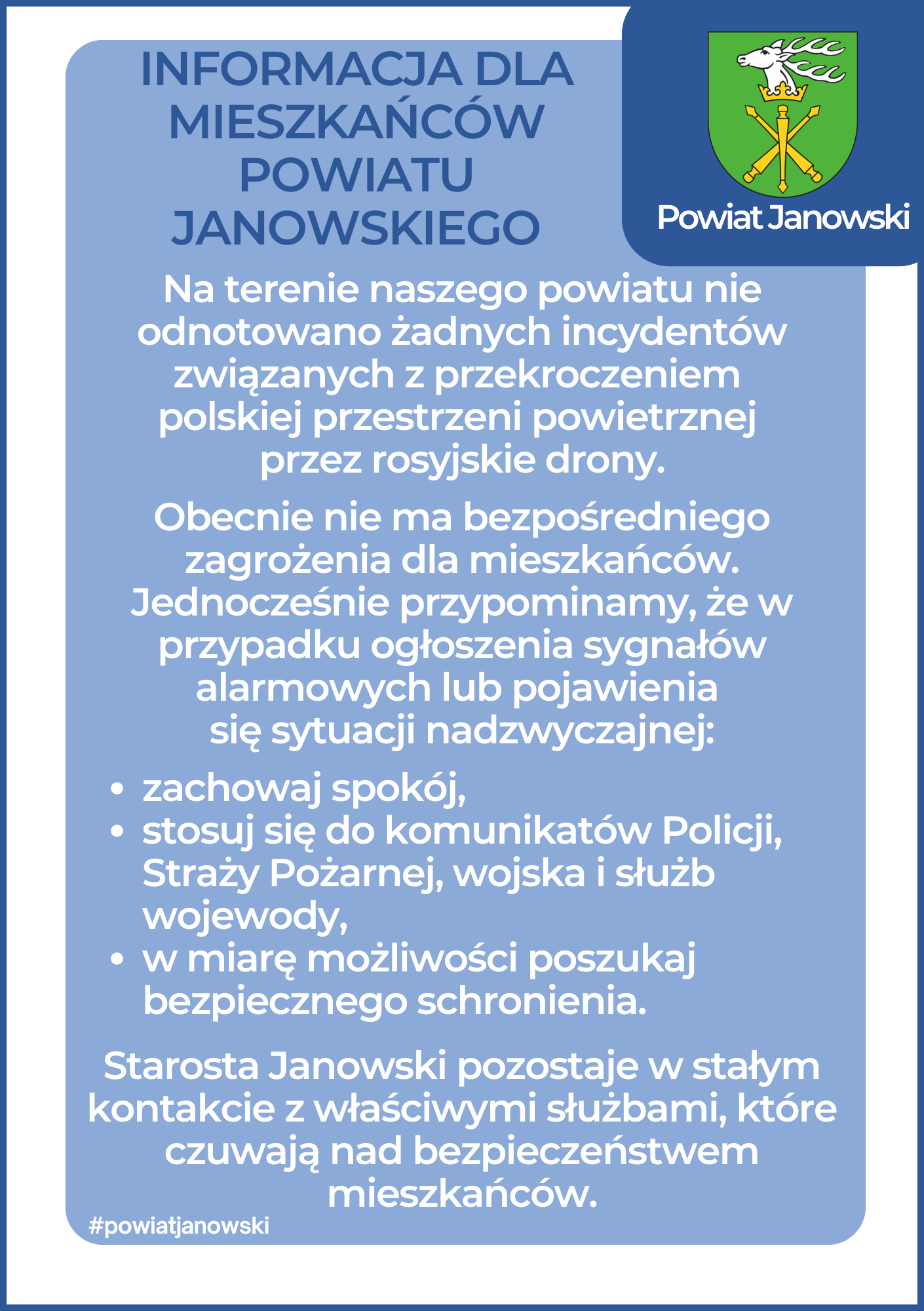 Na terenie powiatu nie odnotowano żadnych incydentów związanych z przekroczeniem polskiej przestrzeni powietrznej przez rosyjskie drony. Obecnie nie ma bezpośredniego zagrożenia dla mieszkańców.