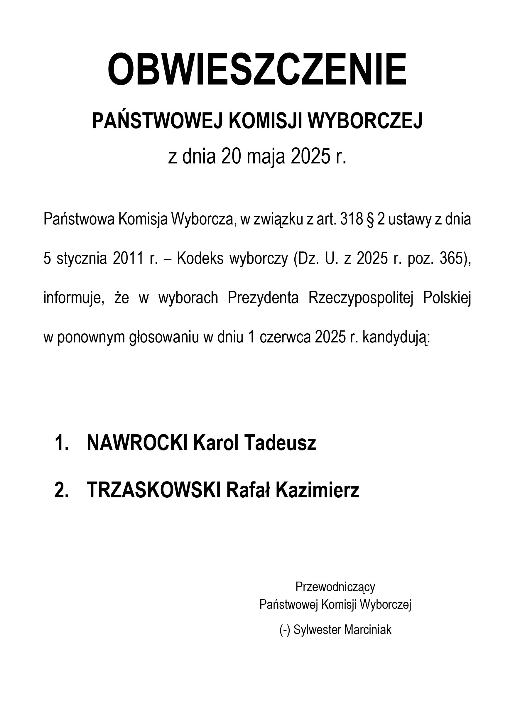 Państwowa Komisja Wyborcza, w związku z art. 318 § 2 ustawy z dnia 5 stycznia 2011 r. – Kodeks wyborczy (Dz. U. z 2025 r. poz. 365), informuje, że w wyborach Prezydenta Rzeczypospolitej Polskiej w ponownym głosowaniu w dniu 1 czerwca 2025 r. kandydują: