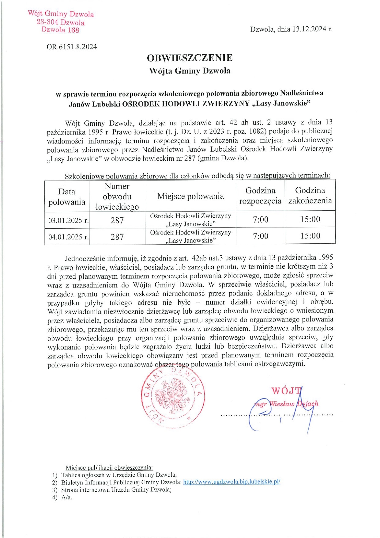 Wójt Gminy Dzwola, działając na podstawie art. 42 ab ust. 2 ustawy z dnia 13 października 1995 r. Prawo łowieckie (t. j. Dz. U. z 2023 r. poz. 1082) podaje do publicznej wiadomości informację terminu rozpoczęcia i zakończenia oraz miejsca szkoleniowego polowania zbiorowego przez Nadleśnictwo Janów Lubelski Ośrodek Hodowli Zwierzyny „Lasy Janowskie” w obwodzie łowieckim nr 287 (gmina Dzwola).