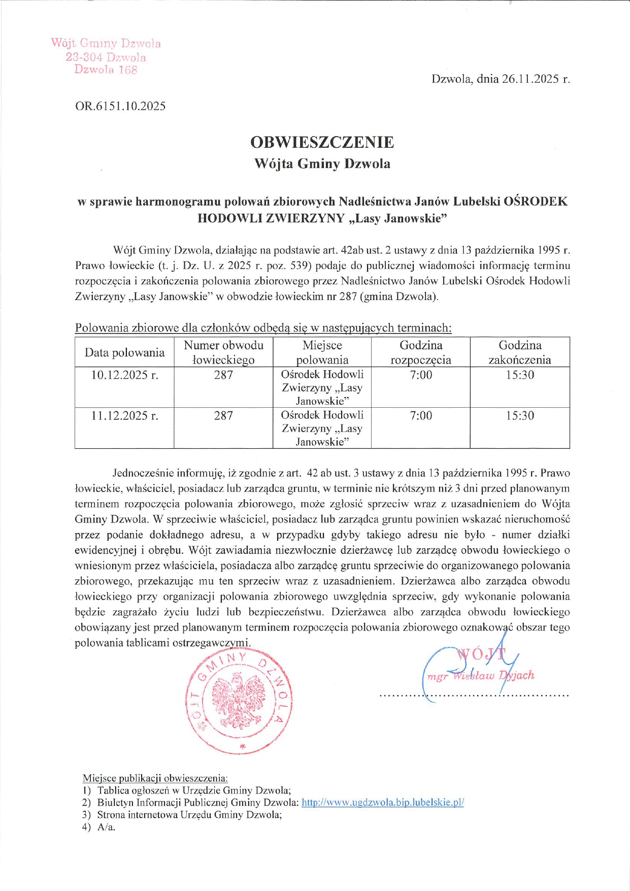 Obwieszczenie Wójta Gminy Dzwola w sprawie terminu polowania zbiorowego Nadleśnictwa Janów Lubelski Ośrodek Hodowli Zwierzyny „Lasy Janowskie” Opublikowano dnia: 26 listopada 2025 - 13:47