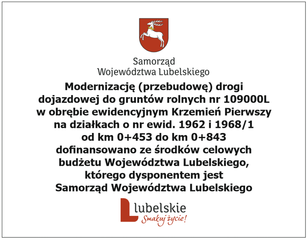 W dniu 5 lipca 2024 r. dokonano odbioru zadania inwestycyjnego pod nazwą „Modernizacja (przebudowa) drogi dojazdowej do gruntów rolnych nr 109000L w obrębie ewidencyjnym Krzemień Pierwszy na działkach o nr ewid. 1962 i 1968/1 od km 0+453 do km 0+843” o łącznej długości ponad 390 m.