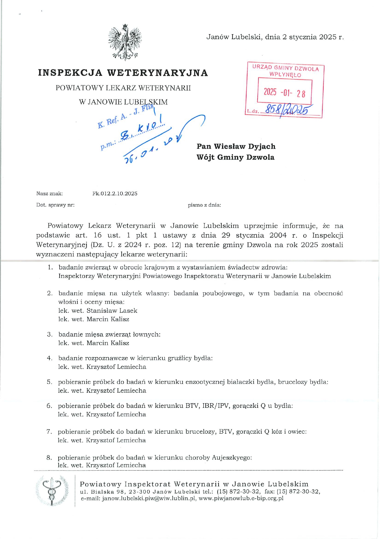 Poniżej podajemy do wiadomości informację Powiatowego Lekarza Weterynarii w Janowie Lubelskim w sprawie wyznaczenia lekarzy weterynarii do wykonywania czynności na terenie gminy Dzwola na rok 2025.