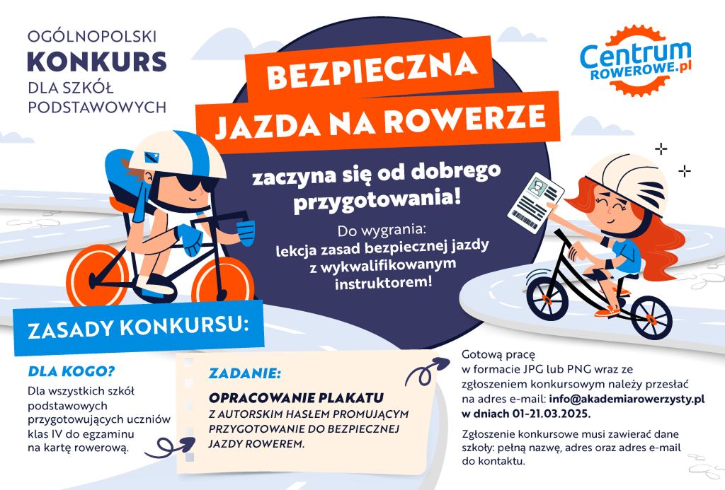 Konkurs skierowany jest do szkół podstawowych. Zadaniem uczniów jest opracowanie plakatu z hasłem promującym przygotowanie do bezpiecznej jazdy rowerem. Gotowe prace w formacie plików JPG lub PNG, wraz z formularzem zgłoszeniowym, należy przesłać na adres e-mail: info@akademiarowerzysty.pl do 21 marca 2025 roku.