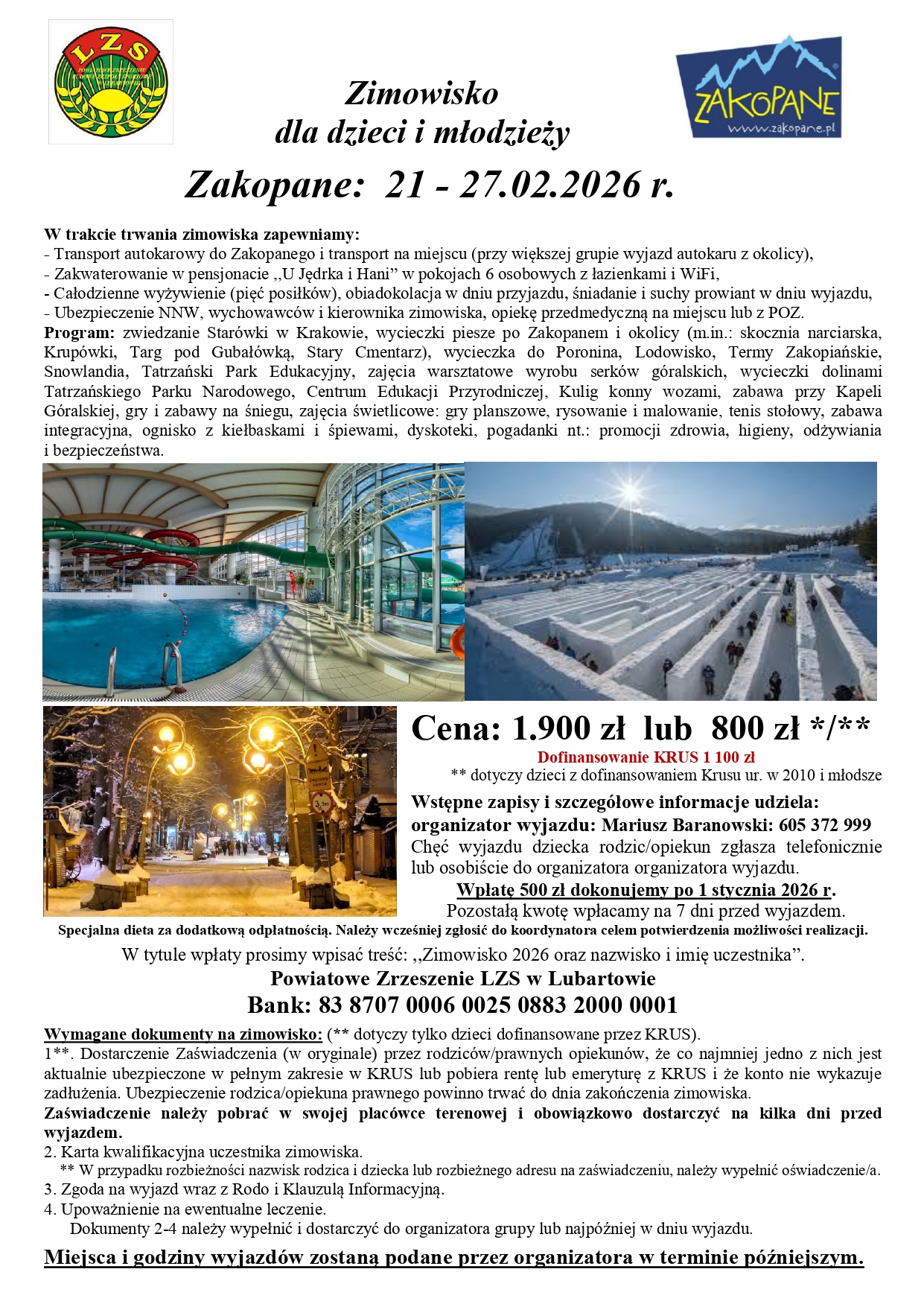 Powiatowe Zrzeszenie LZS w Lubartowie wraz z Funduszem Składkowym Ubezpieczenia Społecznego Rolników proponuje wypoczynek zimowy dla dzieci w przedziale wiekowym do lat 16 (urodzonych w 2010 roku i młodszych), których przynajmniej jedno z rodziców jest płatnikiem pełnej składki KRUS.