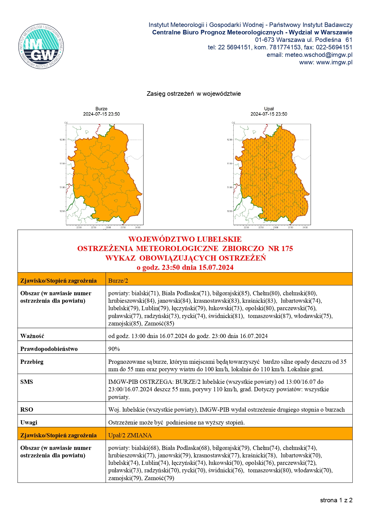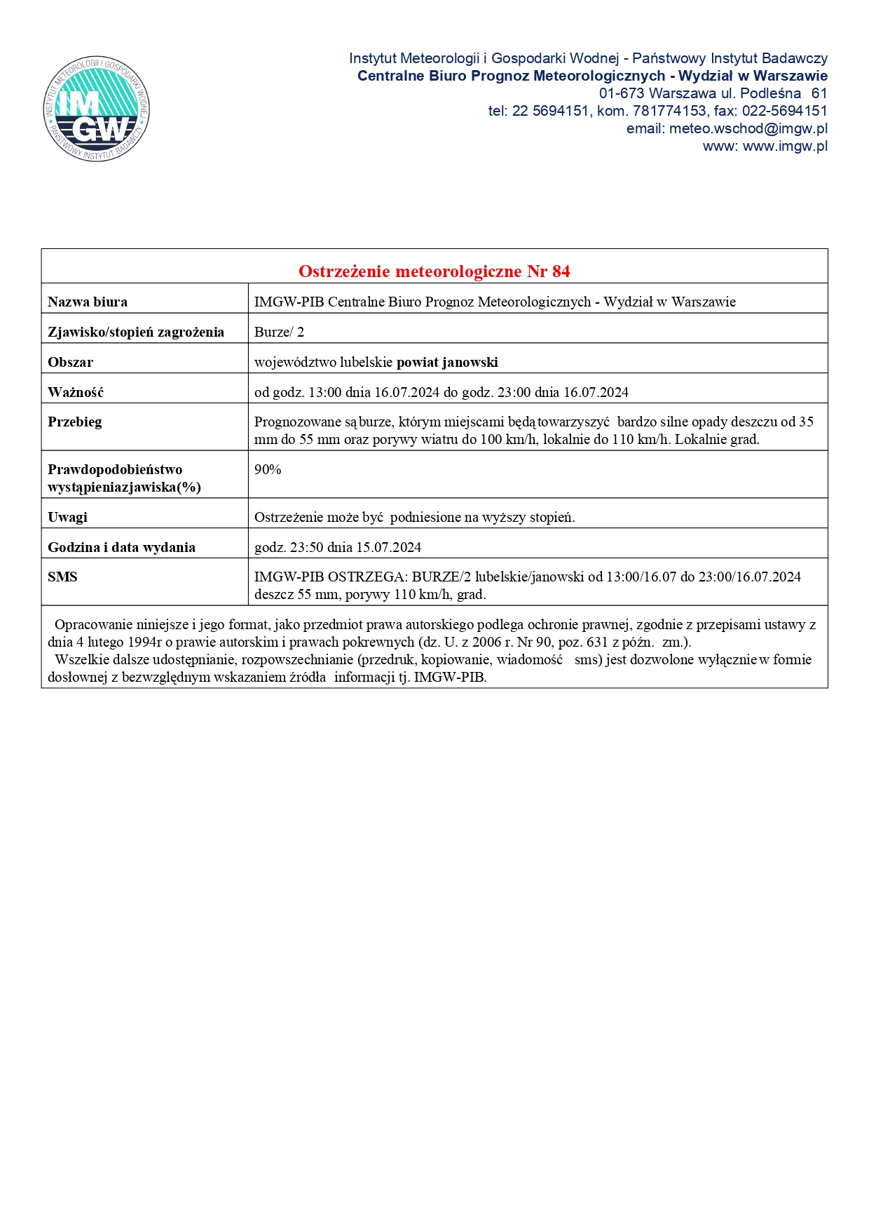 Ważność: od godz. 13:00 dnia 16.07.2024 do godz. 02:00 dnia 17.07.2024 Obszar: zlewnie dopływów Wisły i Bugu (lubelskie)