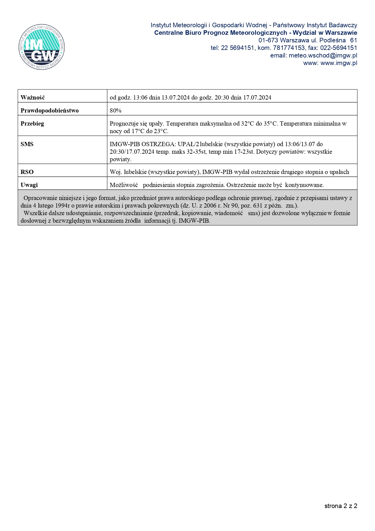 Ostrzeżenia meteorologiczne: Upał stopień: 2 prawd. 80% Przebieg: Prognozuje się upały. Temperatura maksymalna od 32°C do 35°C. Temperatura minimalna w nocy od 17°C do 23°C. Uwagi: Możliwość podniesienia stopnia zagrożenia. Ostrzeżenie może być kontynuowane. Ważne: Od: 2024-07-13 13:06 Do: 2024-07-17 20:30 Czas wydania: 2024-07-13 13:06