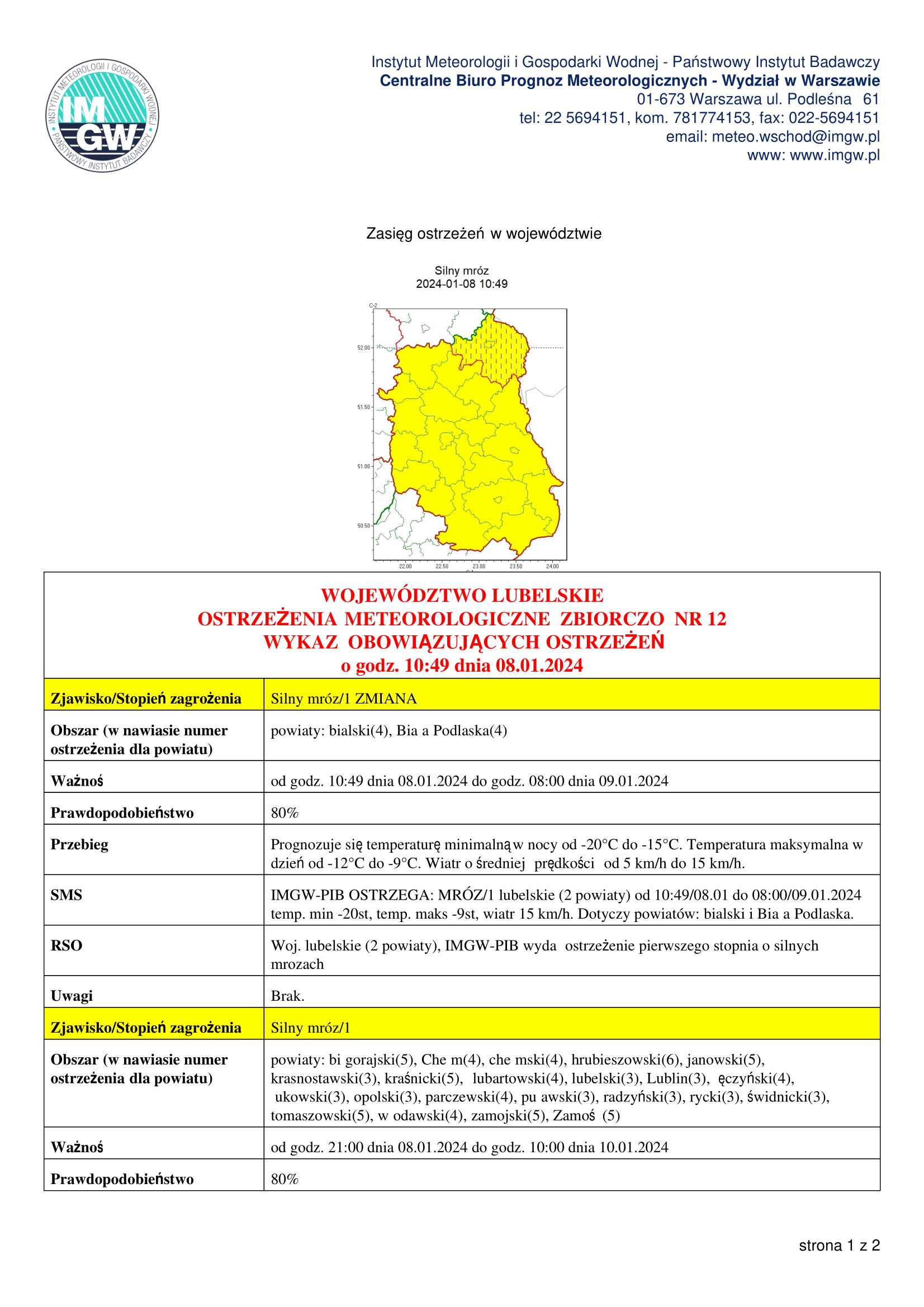 Ostrzeżenia meteorologiczne: Silny mróz stopień: 1 prawd. 80%