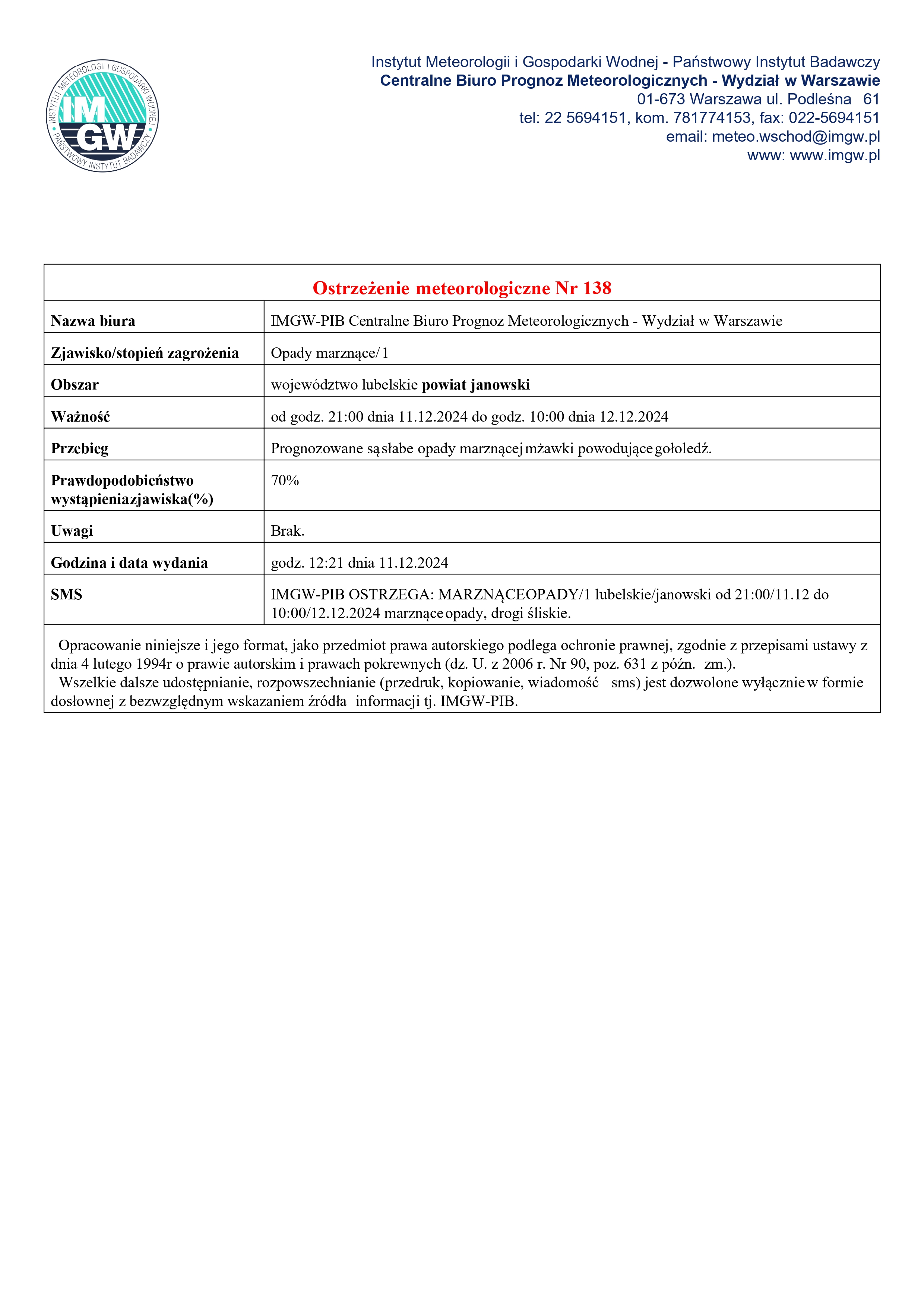 Ostrzeżenia meteorologiczne Opublikowano dnia: 11 grudnia 2024 - 08:03 Ostrzeżenia meteorologiczne: Opady marznące stopień: 1 prawd. 70% Przebieg: Prognozowane są słabe opady marznącej mżawki powodujące gołoledź. Uwagi: Brak. Ważne: Od: 2024-12-11 21:00 Do: 2024-12-12 10:00 Czas wydania: 2024-12-11 12:21