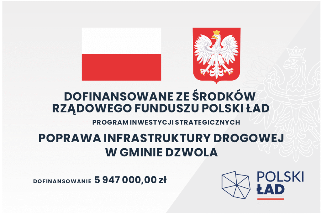 Inwestycja Poprawy infrastruktury drogowej w gminie Dzwola obejmuje przebudowę oraz remont 13 odcinków dróg gminnych. Koszt inwestycji to 6 386 694,89 zł z czego dofinansowanie z Rządowego Funduszu Polski Ład: Program Inwestycji Strategicznych wynosić będzie 5 947 000,00 zł, a wkład własny Gminy Dzwola to 439 694,89 zł.