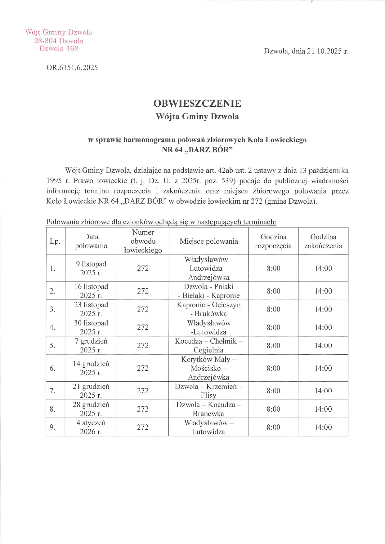 Plan polowań zbiorowych Koła Łowieckiego „Darz Bór”