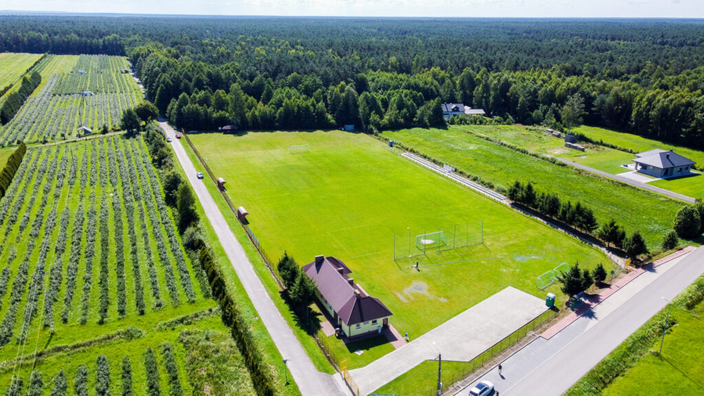 - wyposażenie boiska: 2 bramki aluminiowe, kabiny dla zawodników, kabina dla pomocy medycznej, 4 bramki treningowe,