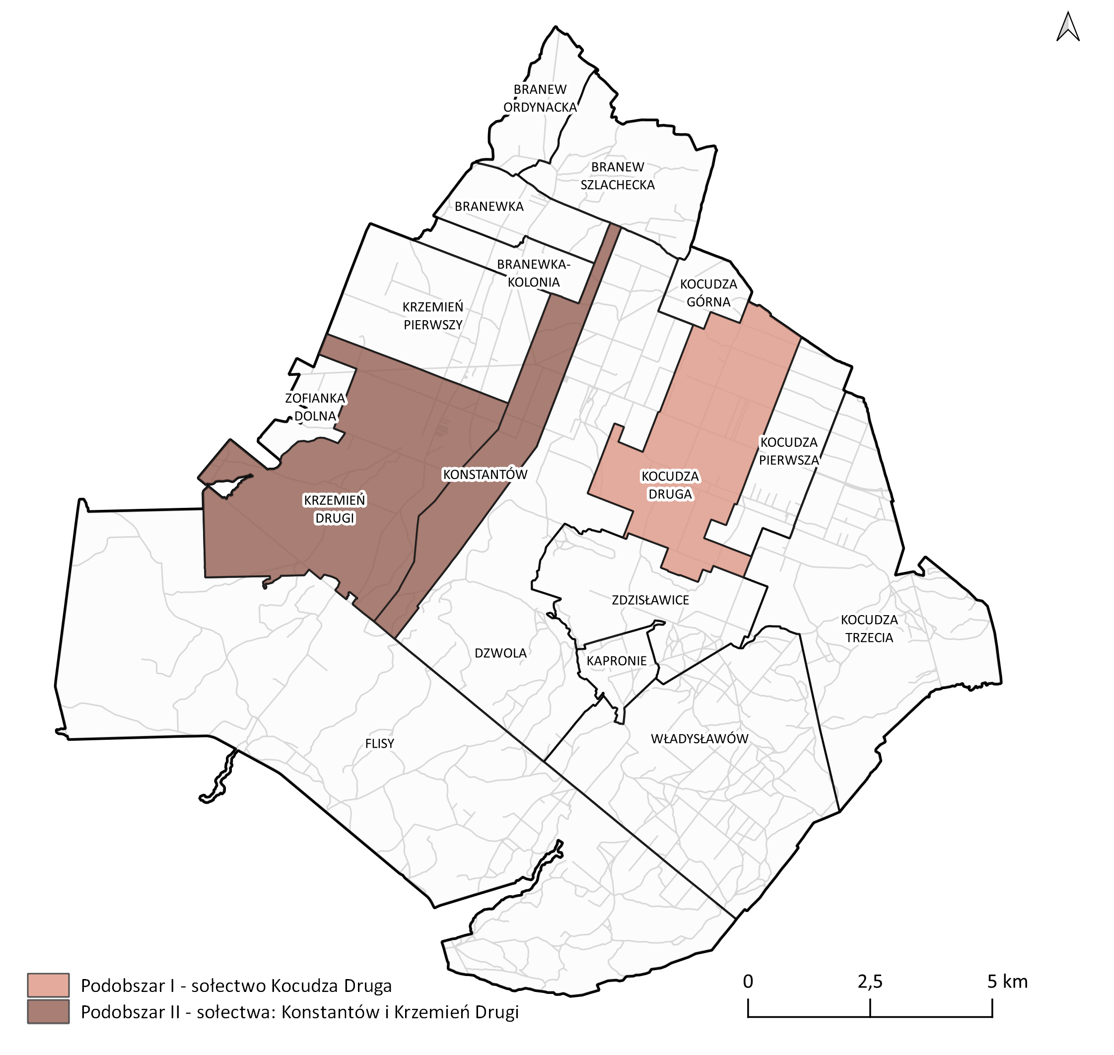 Wyznaczony obszar rewitalizacji obejmuje następujące miejscowości: Kocudza Druga, Krzemień Drugi oraz Konstantów.