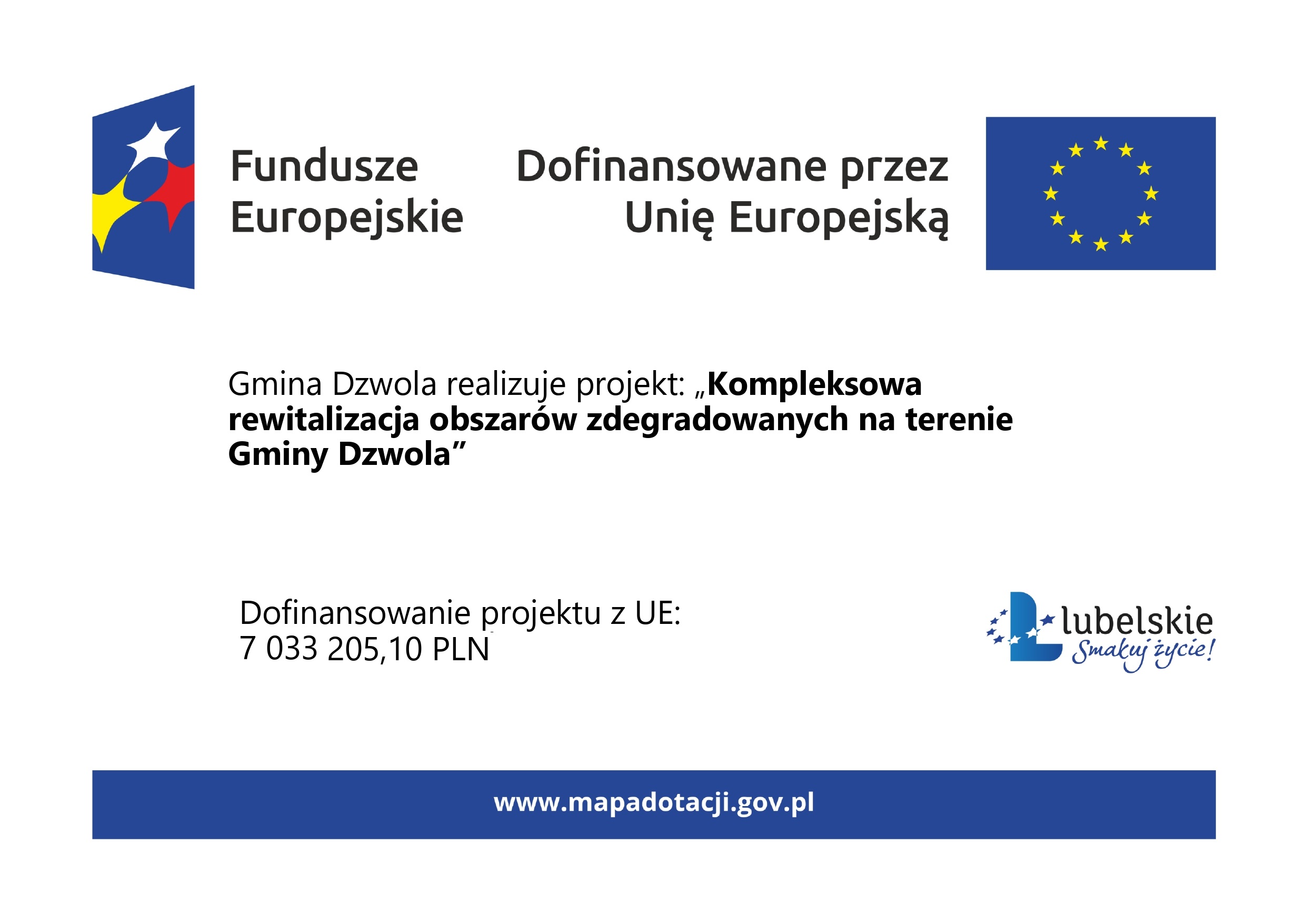 Wójt Gminy Dzwola informuje, że po pozytywnej ocenie wniosku o dofinansowanie projektu nr FELU.11.01-IZ.00-0022/24, pn. „Kompleksowa rewitalizacja obszarów zdegradowanych na terenie Gminy Dzwola”, złożonego w ramach naboru nr FELU.11.04-IZ.00-001/24, Działania 11.04 Rewitalizacja obszarów innych niż miejskie, Priorytetu XI Rozwój zrównoważony terytorialnie programu Fundusze Europejskie dla Lubelskiego 2021 – 2027 w dniu 05.08.2025 została podpisana umowa o dofinansowanie przedsięwzięcia nr FELU.11.04-IZ.00-0022/24.