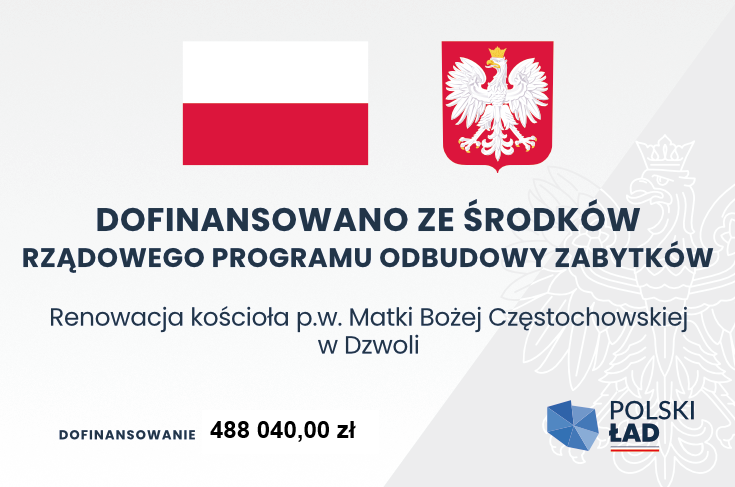 Wykonanie powyższych prac jest możliwe dzięki otrzymanemu przez Gminę Dzwola dofinansowaniu z Rządowego Programu Odbudowy Zabytków, które to Gmina Dzwola przekaże Parafii w Dzwoli na wykonanie przedmiotowej inwestycji. Koszt tej inwestycji to kwota 498 000,00 zł, z czego dofinansowanie wynosi 488 040,00 zł a dotacja Gminy Dzwola 9 960,00 zł.
