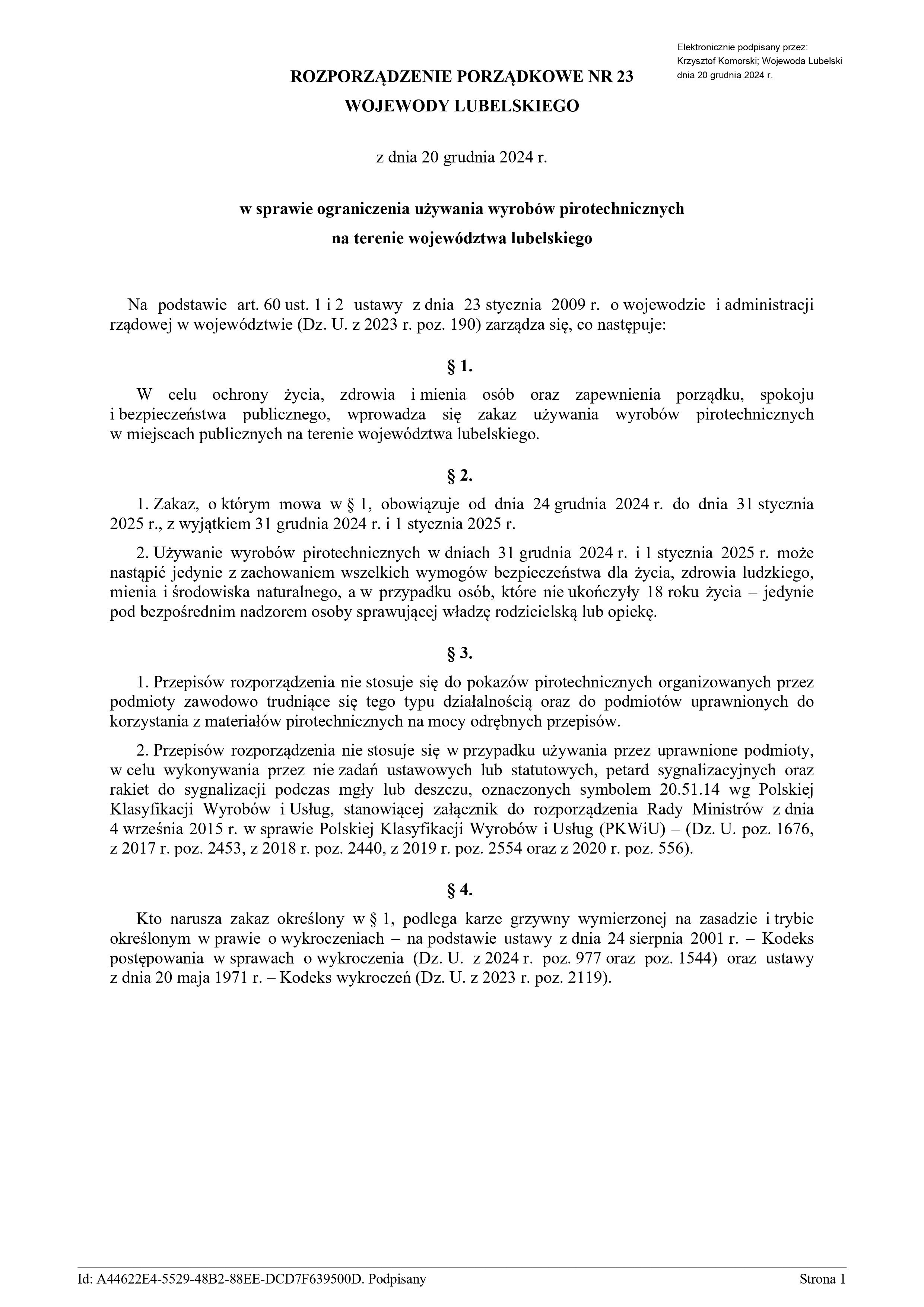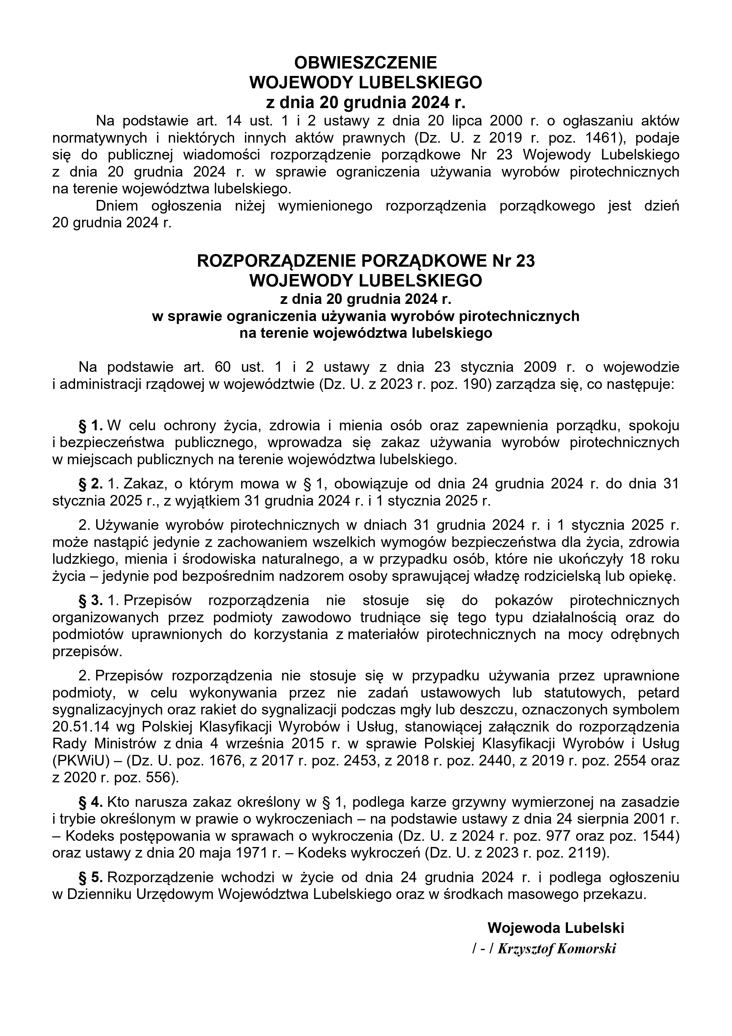 W celu ochrony życia, zdrowia i mienia osób oraz zapewnienia porządku, spokoju i bezpieczeństwa publicznego, wprowadza się zakaz używania wyrobów pirotechnicznych w miejscach publicznych na terenie województwa lubelskiego.