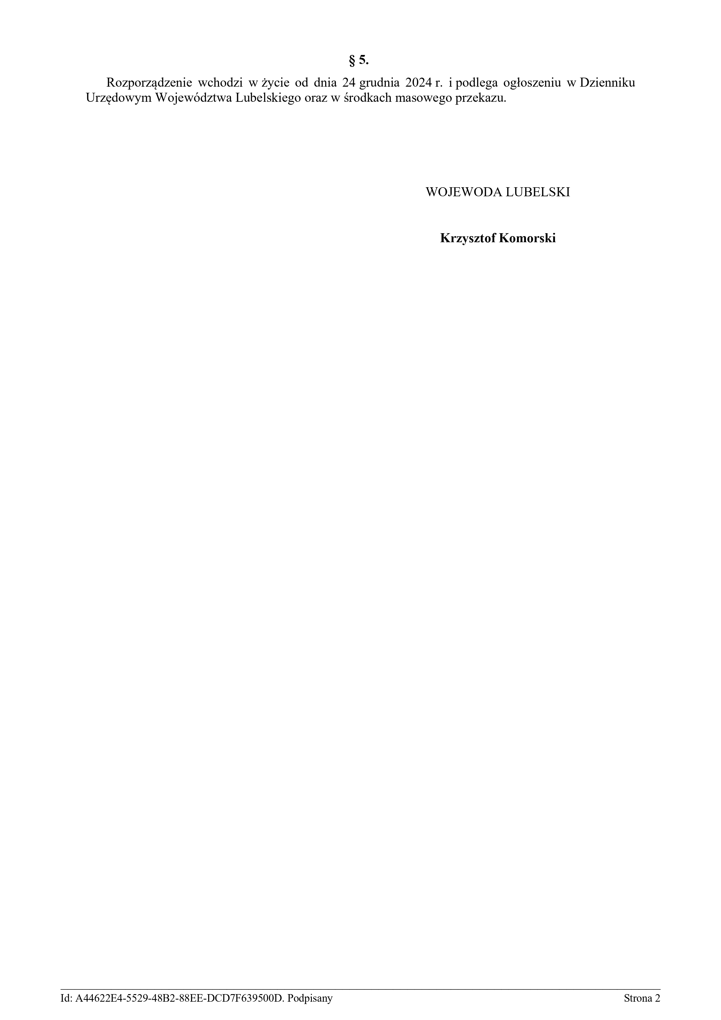 Rozporządzenie wchodzi w życie od dnia 24 grudnia 2024 r. i podlega ogłoszeniu w Dzienniku Urzędowym Województwa Lubelskiego oraz w środkach masowego przekazu.
