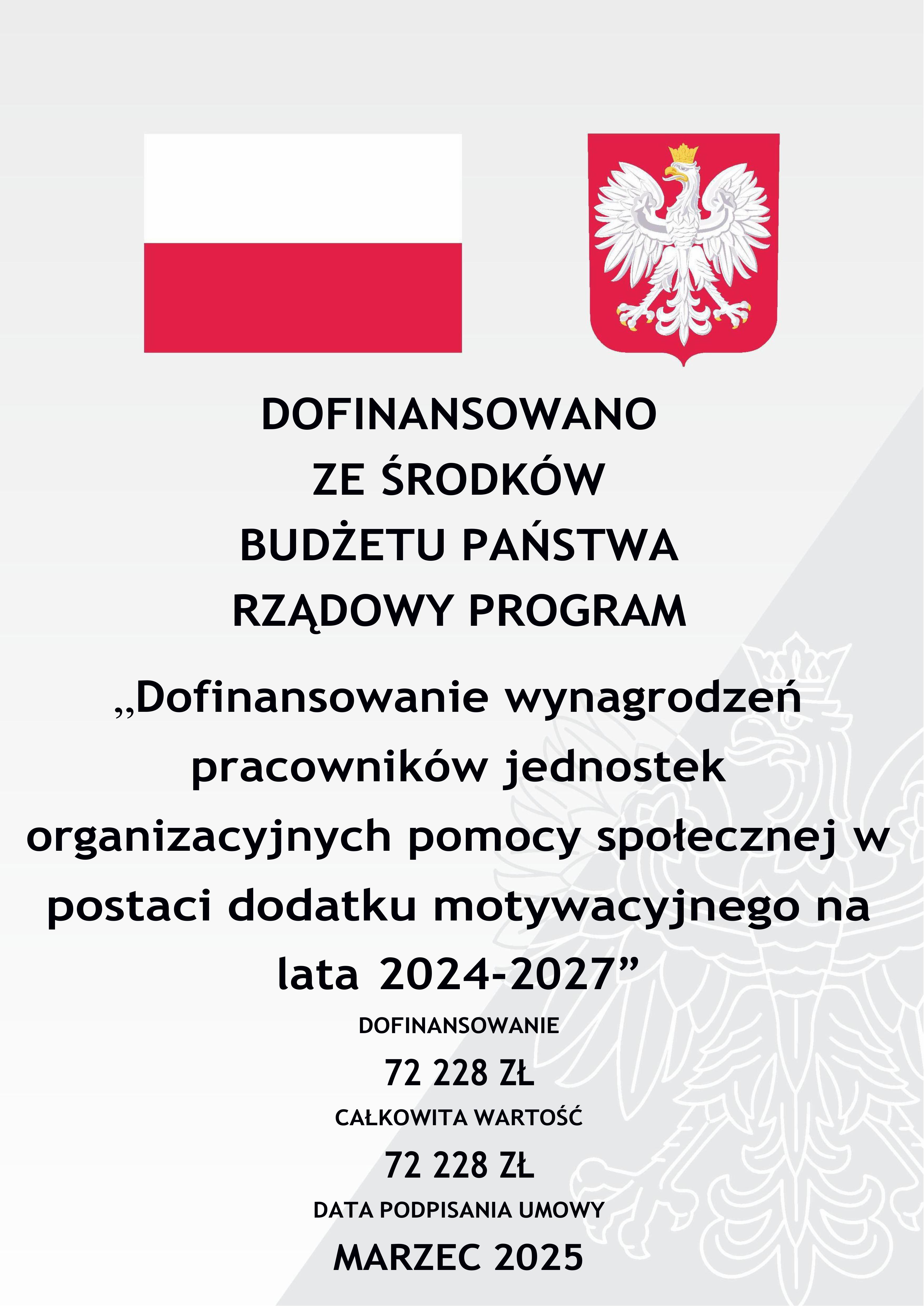 Gmina Dzwola informuje, iż otrzymała na 2025 r. dotację celową z budżetu państwa na realizację zadania wynikającego z rządowego Programu ”Dofinansowanie wynagrodzeń pracowników jednostek organizacyjnych pomocy społecznej w postaci dodatku motywacyjnego na lata 2024-2027” na podstawie Uchwały nr 62 Rady Ministrów z dnia 19 czerwca 2024 r. w sprawie ustanowienia rządowego programu „Dofinansowanie wynagrodzeń pracowników jednostek organizacyjnych pomocy społecznej w postaci dodatku motywacyjnego na lata 2024-2027”.