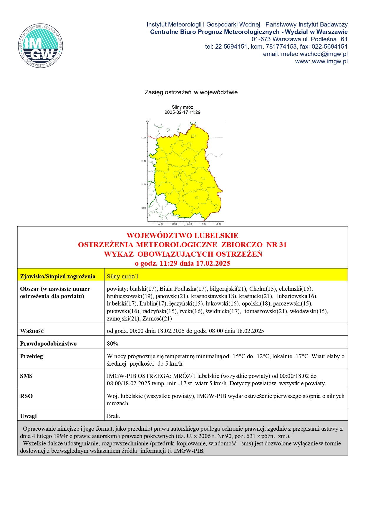 Ostrzeżenia meteorologiczne: Silny mróz stopień: 1