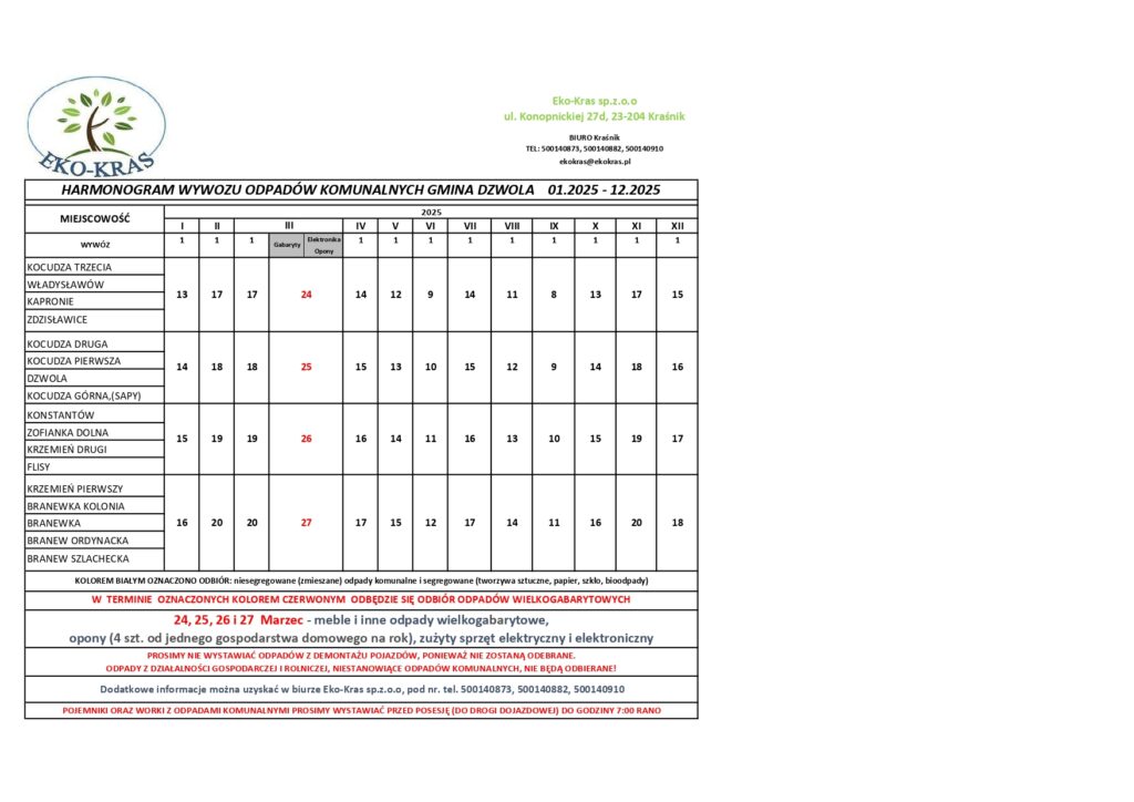 Poniżej zamieszczamy szczegółowy harmonogram wywozu odpadów komunalnych z pojemników i odbioru odpadów segregowanych z terenu Gminy Dzwola w okresie od dnia 1 stycznia 2025 r. do dnia 31 grudnia 2025 r.