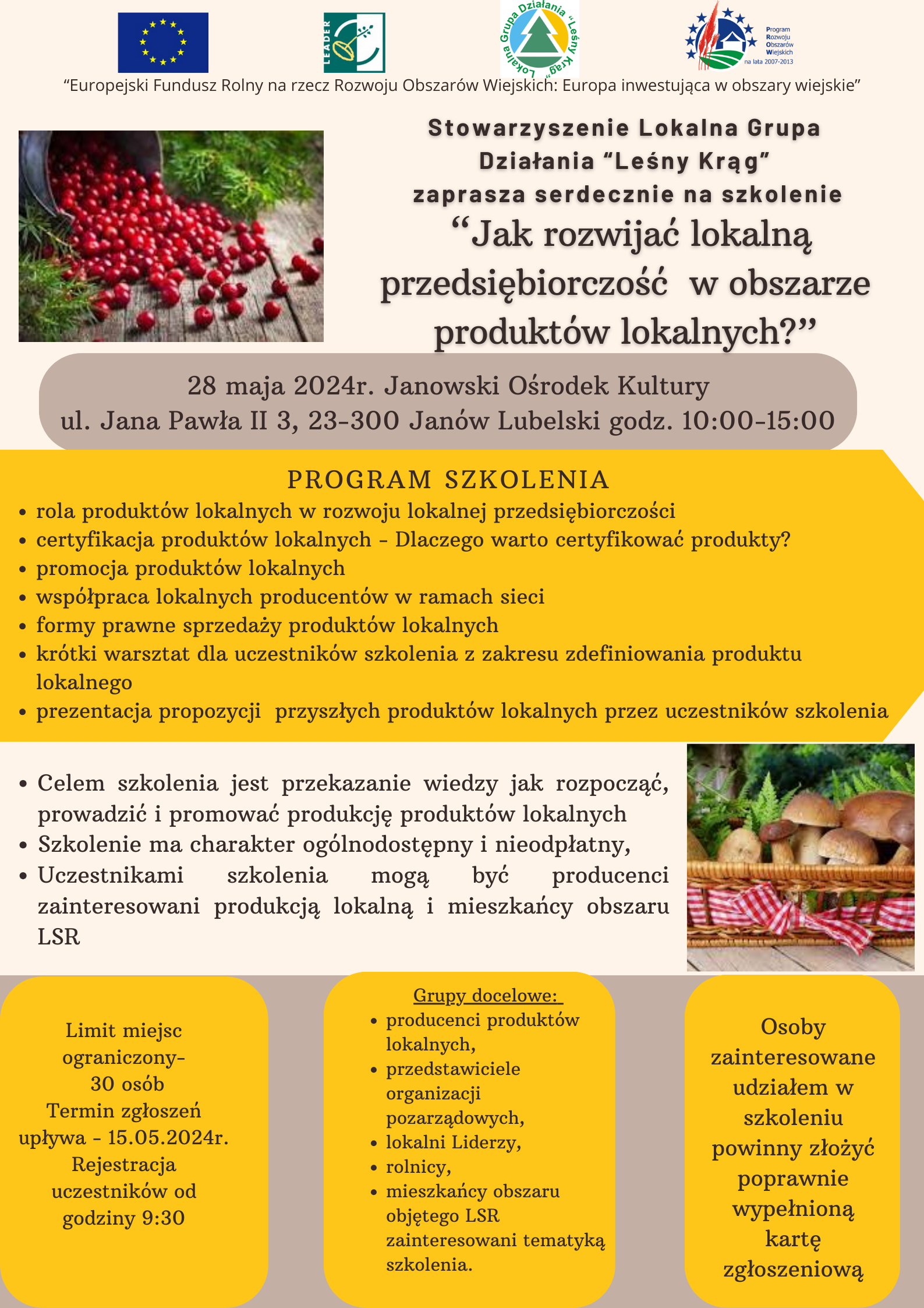 Osoby zainteresowane szkoleniem powinny złożyć zgłoszenia w terminie do 15 maja 2024 r. w siedzibie Stowarzyszenia Lokalna Grupa Działania „Leśny Krąg” – ul. Ogrodowa 16, 23-300 Janów Lubelski.