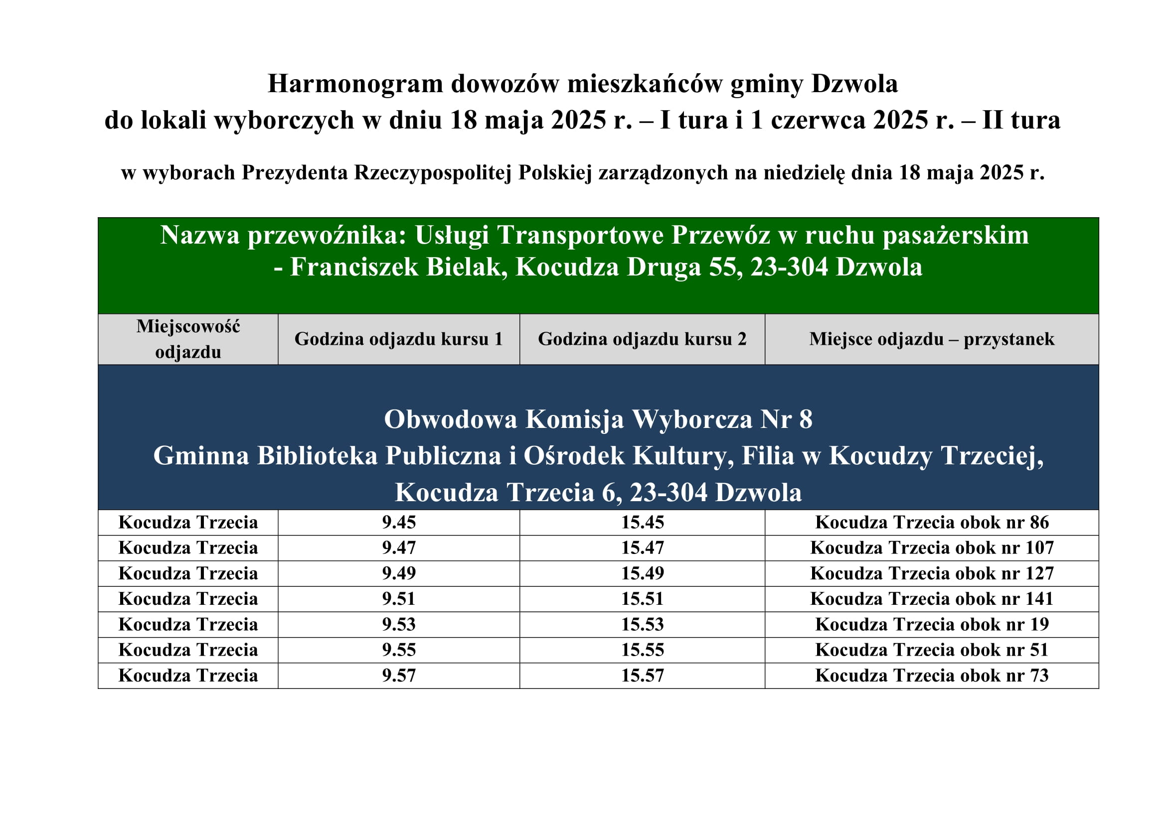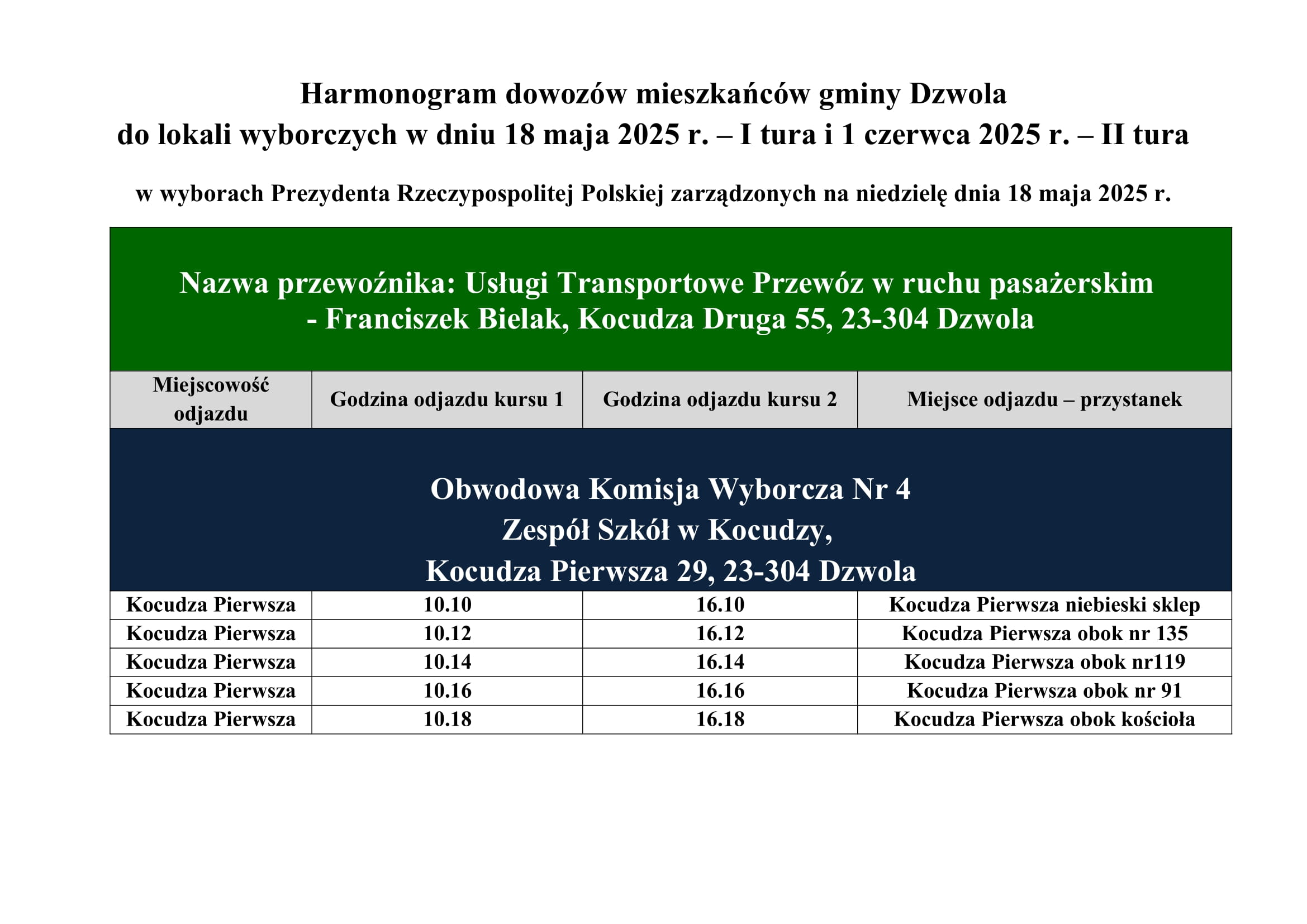 Mając powyższe na względzie Wójt Gminy Dzwola informuje, iż w dniu wyborów Prezydenta Rzeczypospolitej Polskiej zarządzonych na niedziele 18 maja 2025 r. uruchomione zostaną na terenie Gminy Dzwola niżej wskazane bezpłatne linie komunikacyjne, na trasie których w dniu głosowania odbędą się dwa pełne kursy wg niniejszego rozkładu. Powrót odbędzie się na tej samej trasie (autobus zatrzyma się na wymienionych wyżej przystankach w odwrotnym kierunku) – odjazd sprzed lokalu wyborczego.