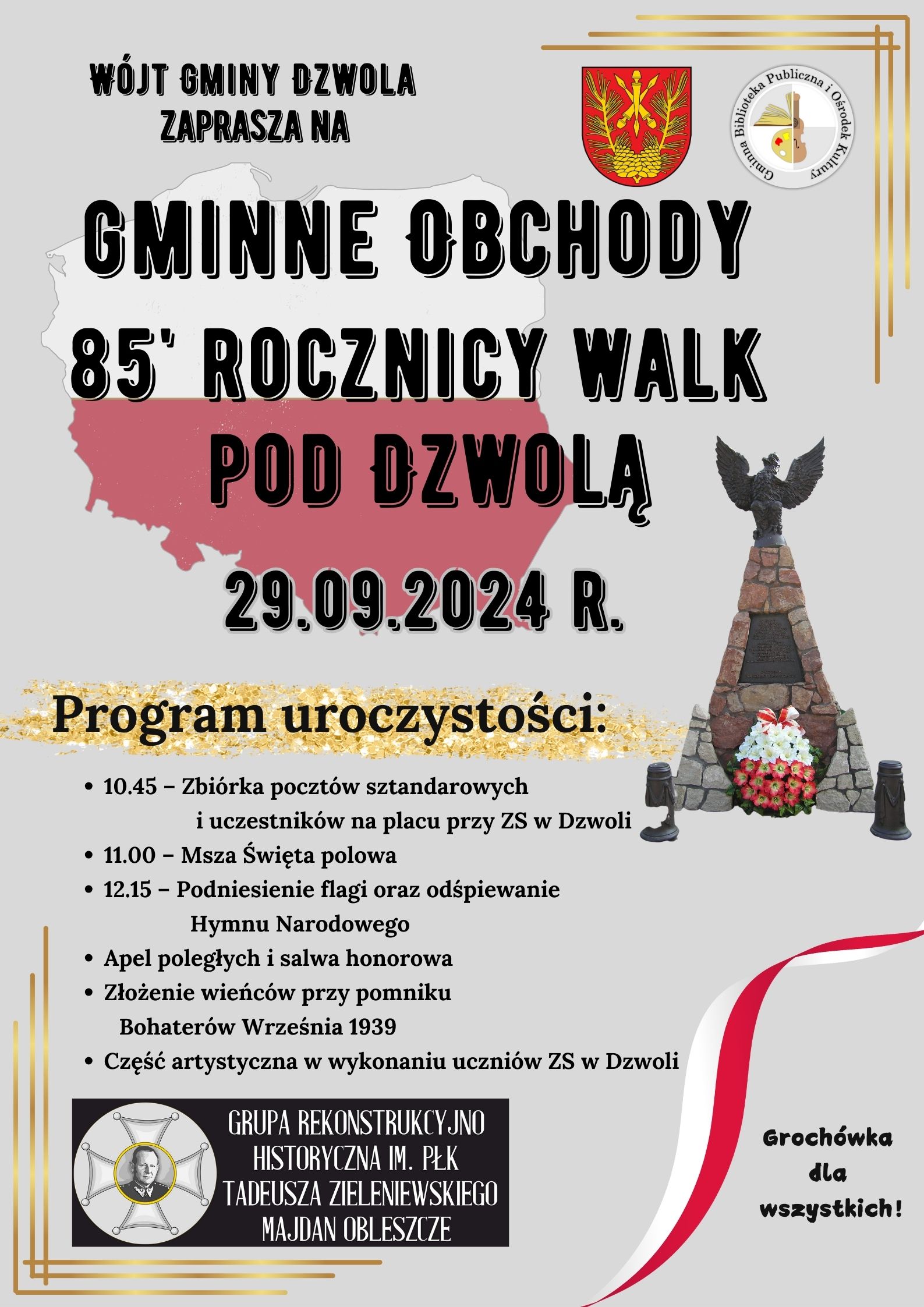 Zaproszenie Opublikowano dnia: 16 września 2024 - 08:54 Gminne Obchody 85′ Rocznicy Walk pod Dzwolą. Szczegóły na plakacie.