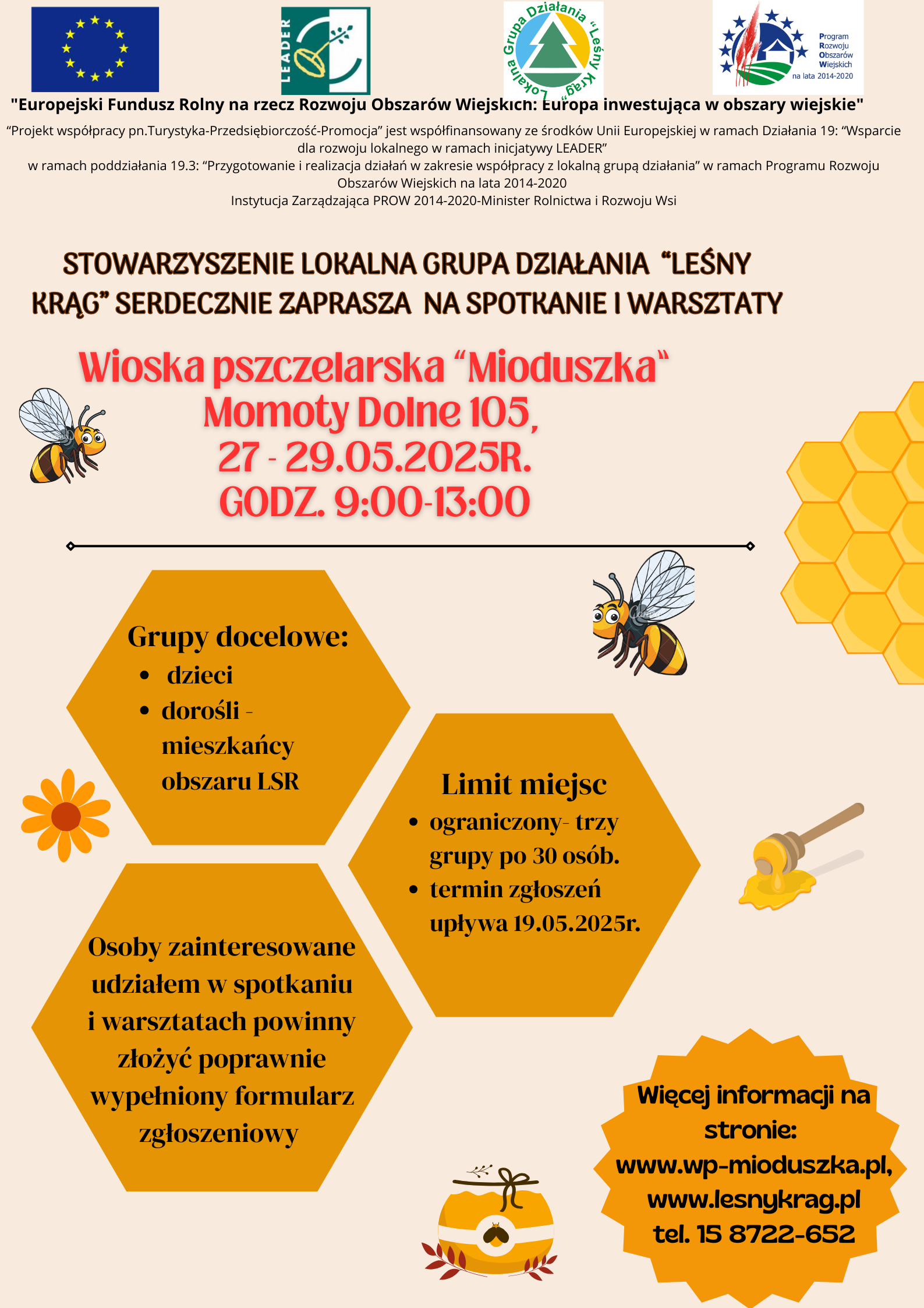 Stowarzyszenie Lokalna Grupa Działania „Leśny Krąg” zaprasza mieszkańców obszaru LGD „Leśny Krąg” na spotkanie i warsztaty w wiosce pszczelarskiej „Mioduszka” w Momotach Dolnych. Udział w warsztatch jest bezpłatny. Więcej szczegółów znajduje się na plakacie, na stronie internetowej www.lesnykrag.pl, www.wp-mioduszka.pl lub pod numerem telefonu 15 8722-652, 690 641 642
