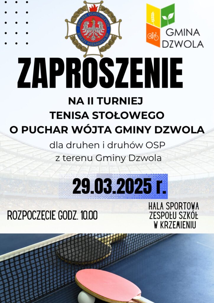 Zaproszenie na II Turniej Tenisa Stołowego Opublikowano dnia: 28 marca 2025 - 12:08 Zaproszenie na II Turniej Tenisa Stołowego o Puchar Wójta Gminy Dzwola w dniu 29 marca 2025 r.