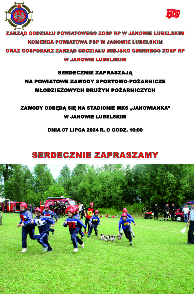 Zaproszenie na Powiatowe Zawody Sportowo – Pożarnicze Młodzieżowych Drużyn Pożarniczych w dniu 7 lipca Opublikowano dnia: 4 lipca 2024 - 13:23 Zaproszenie na Powiatowe Zawody Sportowo – Pożarnicze Młodzieżowych Drużyn Pożarniczych w dniu 7 lipca