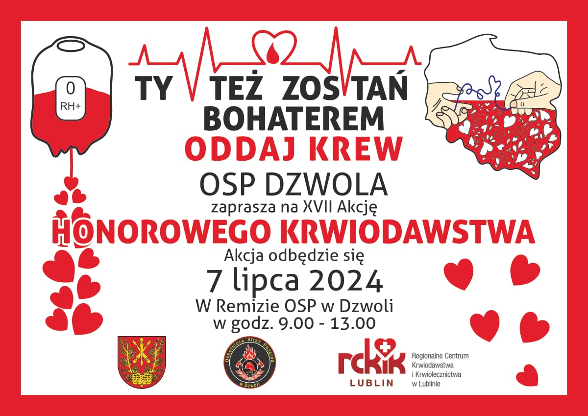 Szanowni Państwo, przypominamy, że już po raz siedemnasty Ochotnicza Straż Pożarna w Dzwoli organizuje akcję honorowego oddawania krwi.