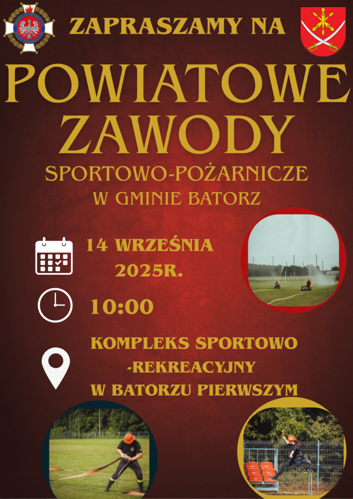 Zaproszenie powiatowe zawody sportowo-pożarnicze Opublikowano dnia: 3 września 2025 - 06:51 Zaproszenie na powiatowe zawody sportowo-pożarnicze MDP i grup A i C, które odbędą się w dniu 14 września 2025 r. w Batorzu. Start rywalizacji MDP godz. 10.00, a planowany start dla Grupy A i B godz. 13.00.