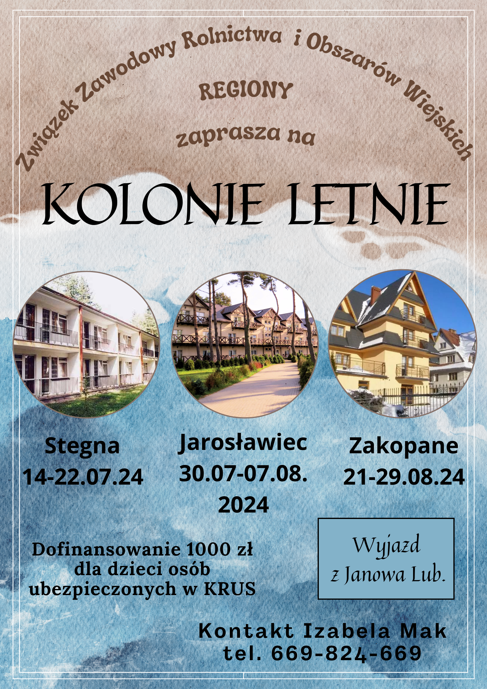 Dzieci rodziców ubezpieczonych w KRUS otrzymują dofinansowanie w kwocie 1000zł ( na podstawie zaświadczenia z KRUS o opłacaniu składek), czyli wpłacają kwotę 900 zł za 9 dni pobytu na kolonii. Dla osób nieubezpieczonych w KRUS jest możliwość skorzystania z wyjazdu w pełnej kwocie (1900 zł). Cena obejmuje przejazd, zakwaterowanie, wyżywienie i atrakcje.