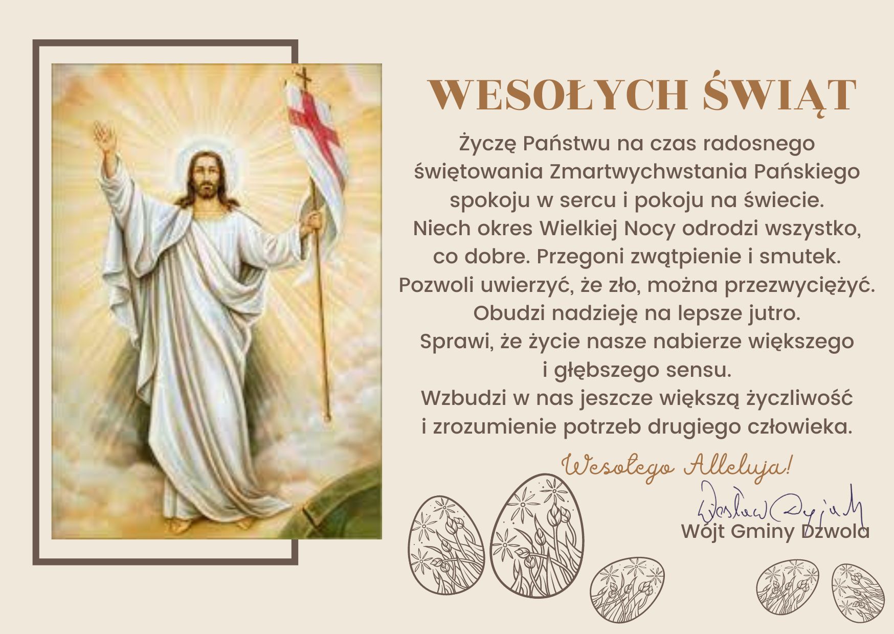 Wielkanoc to czas otuchy i nadziei, to czas odradzania wszystkiego, co piękne i dobre w człowieku. Czas odradzania się wiary w siłę Chrystusa i drugiego człowieka. Wielkanoc przypomina nam, że nigdy nie należy tracić nadziei, ponieważ bez względu na to, jak ciemna jest droga, którą się poruszamy, na jej końcu zawsze znajduje się światło.